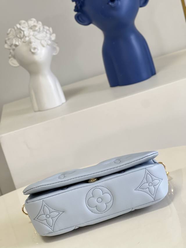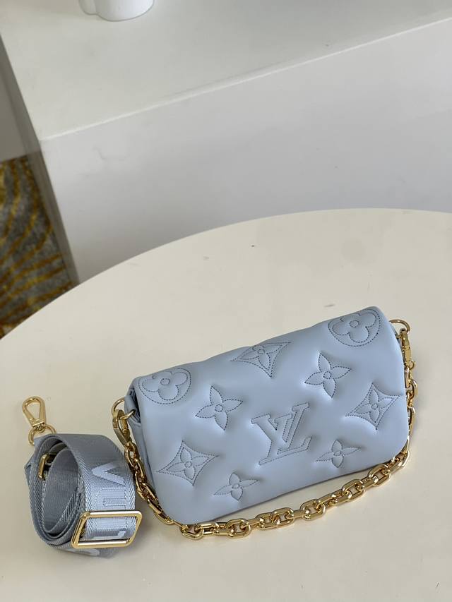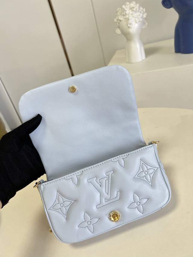 顶级原厂 M81399蓝本款 Wallet On Strap 手袋来自 Bubblegram 系列,为柔软加衬牛皮革刺绣经典 Monogram 图案。磁扣翻盖开