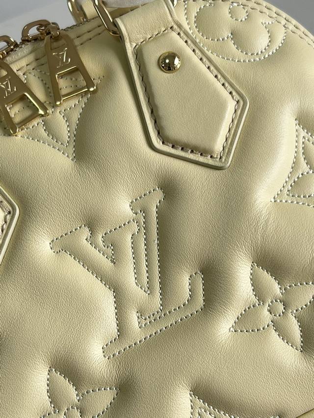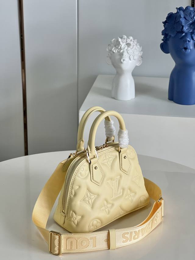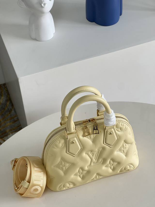 / 顶级原单 M59821黄本款 Alma Bb 手袋秉承 1930 年代装饰艺术风格精髓,为形态丰盈的绗缝牛皮革刺绣 Monogram 图案,搭配轧制皮革手柄和可