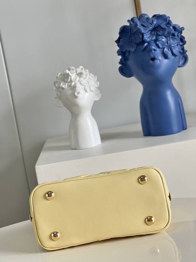 顶级原单 M59821黄本款 Alma Bb 手袋秉承 1930 年代装饰艺术风格精髓,为形态丰盈的绗缝牛皮革刺绣 Monogram 图案,搭配轧制皮革手柄和可