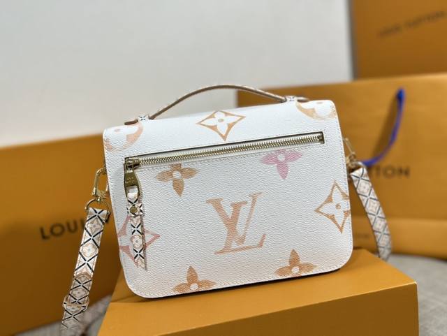 顶级原厂 复刻独家实拍M23055杏,本款 Pochette Metis 手袋以帆布烘托 Lv 字母和 Monogram 花卉的水彩效果,为顶部手柄和可拆卸肩带