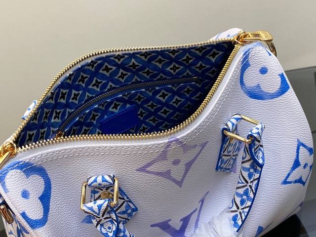 顶级原厂 复刻独家实拍新款M23073蓝,本款 Speedy BandoulièRe 25 手袋令涂层帆布映现 Giant Monogram 图案的粉彩效果,再为饰边、手柄、手柄环和内衬铺陈繁复图案,灵感源自巴黎郊外阿涅勒工坊的瓷砖。