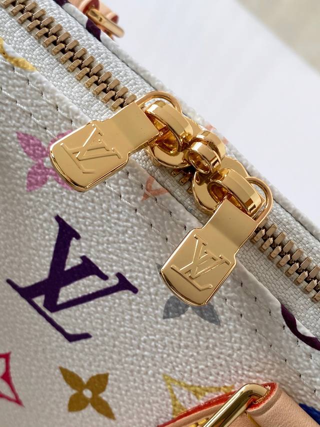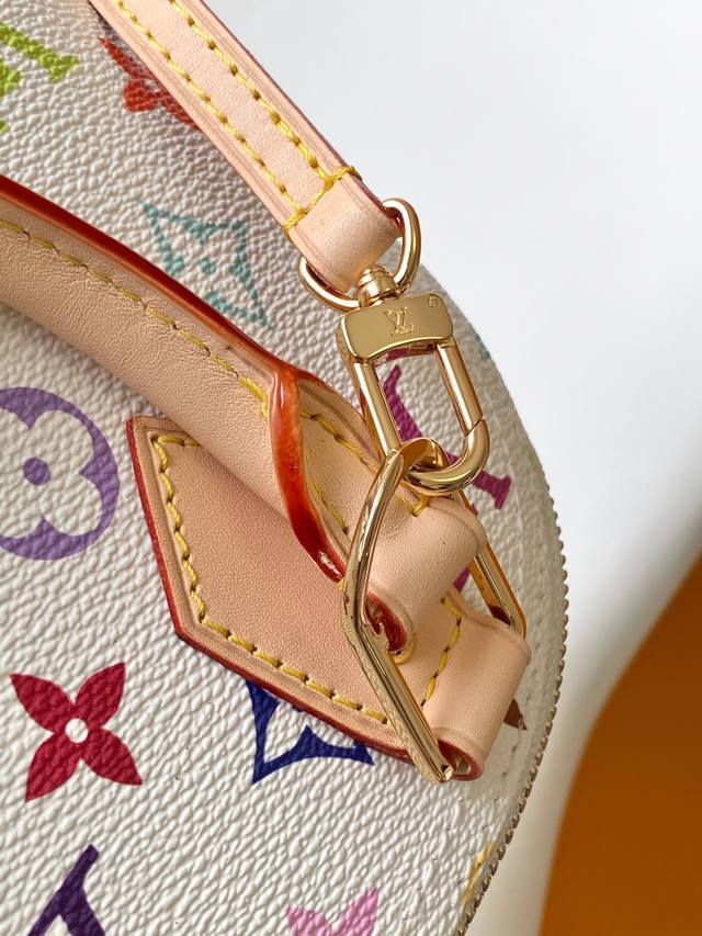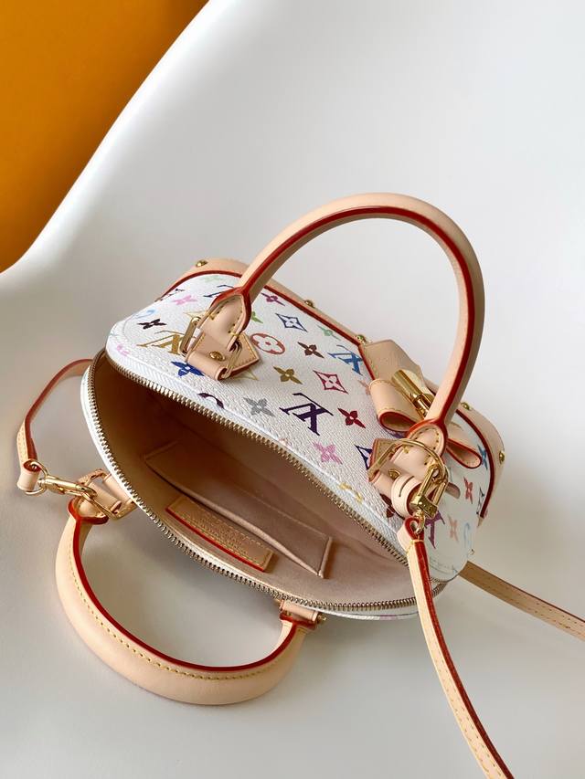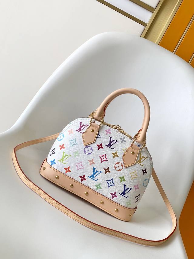 海原外单 独实家拍 163芯片 M13078 本款 Alma Bb 手袋洋溢路易 X 村上隆合作系列的欢欣格调,巧妙回溯 1930 年代的装饰艺术风格设计。Monogram 涂层帆布渲染村上隆笔下的谐趣色调,Toron 手柄、包底、可拆卸肩带和 L X Tm 钥匙包融入经典牛皮革元素。17.5 X 11.5 X 23.5厘米 高 X 宽 X 长度