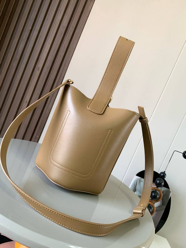 迷你柔软粒面牛皮革 pebble Bucket 水桶手袋pebble将纯粹的简约线条与瞩目设计风格巧妙融合造就别具一格的创新的手袋设计。标志性的 Anagram 雕刻五金件兼具装饰和实用功能,可调节肩带长度并适合多种携带方式,独特的扭曲结构与微妙的细节相得益彰。此迷你版本采用柔软粒面牛皮革制成。可斜挎、肩背或手提*可调节可拆卸肩带*磁扣开合*内袋*合成革衬里*