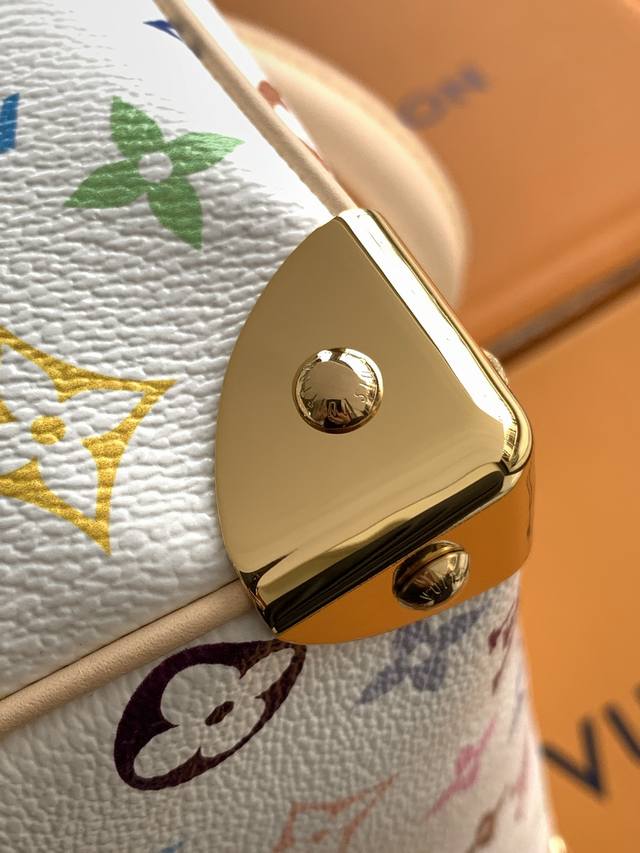 特级原厂全钢 M13085 本款Speedy Bandouliere25手袋为经典Monogram图案渲染日本艺术家村上隆笔下的明丽色调,与蝴蝶结造型钥匙包一道彰显路易威登×村上隆合作系列的灵动风采。牛皮革塑造Toron手柄和可拆卸并调节的肩带,耀目挂锁和包角援引品牌行李箱元素。尺寸:25 × 19 × 15 Cm