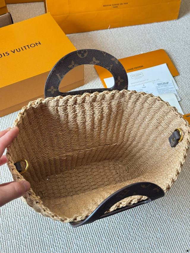 Lv 编织水桶包 来推荐这只阳光草编包,编织和皮革,清爽也文艺,让你也可甜可美。 设计也非常实用,容量也大。同款哦夏天怎么能少了草编包呢 尺寸 22 25Cm