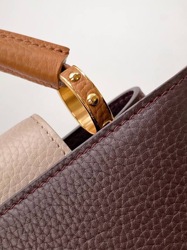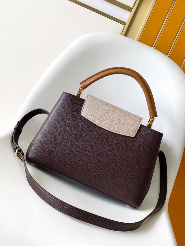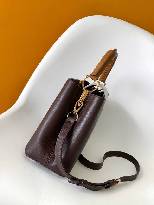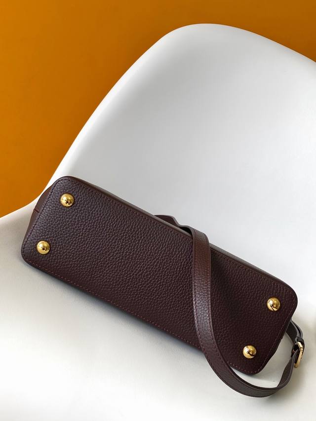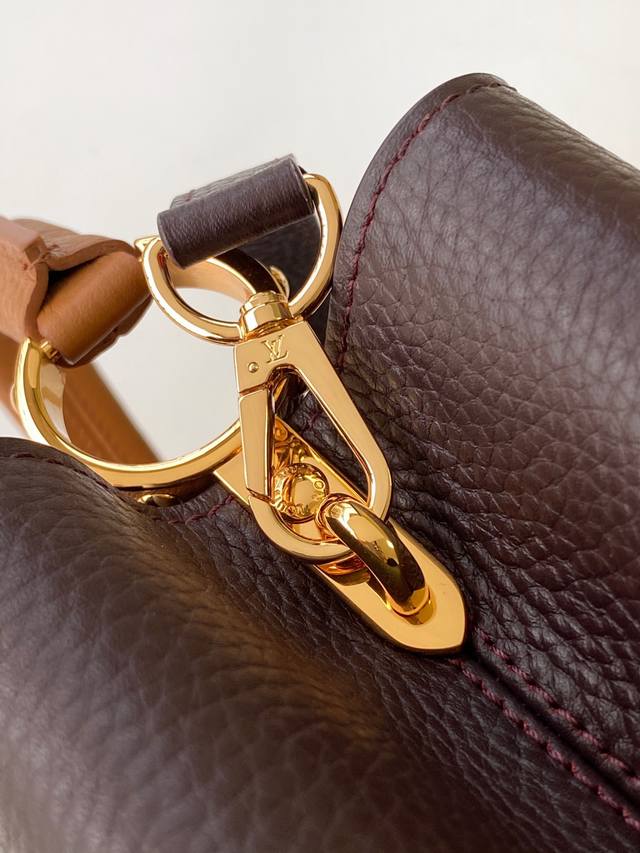 M12956浅咖 M12952啡色 M14176 棕色 特级原厂 动态163 本款 Capucines 中号手袋为华美 Taurillon 牛皮革渲染新季典雅色调,以耀目金属件和 Lv 字母点睛细节。可外置或内收的翻盖开启齐整内层,拉链口袋便于稳妥收纳贵重物品,可拆卸并调节的肩带实现灵活背携。