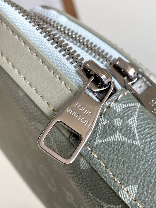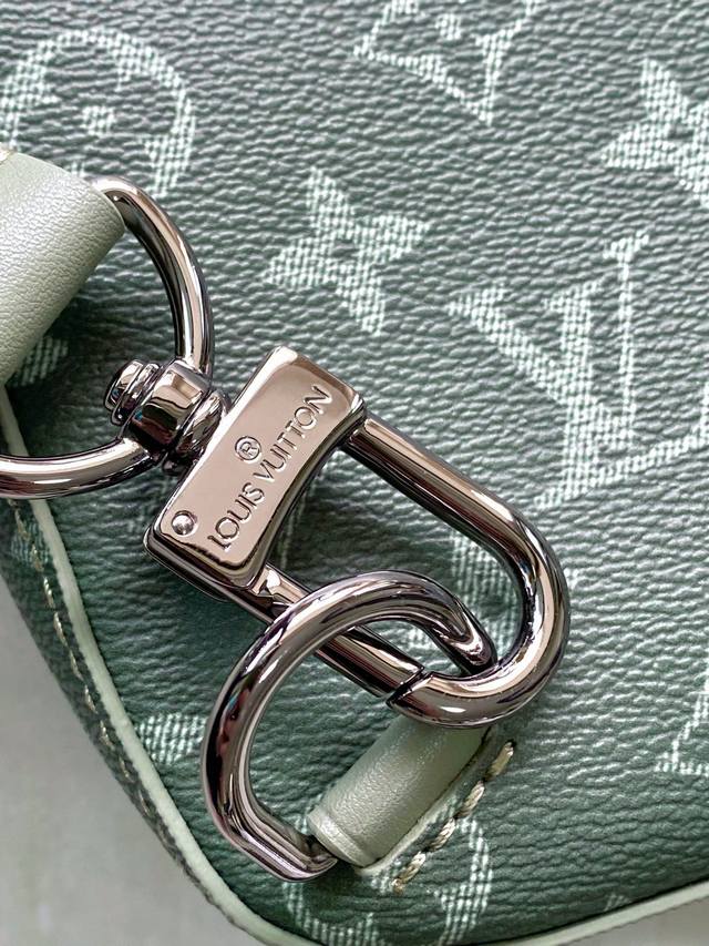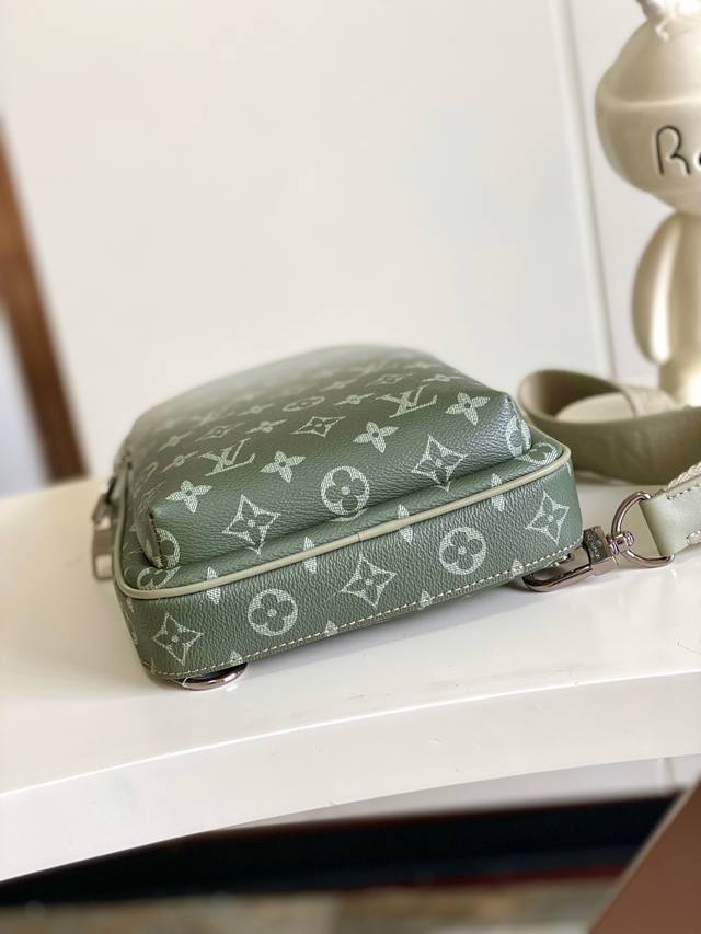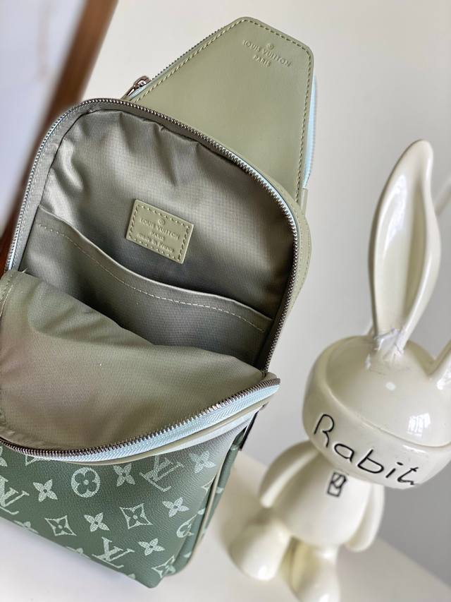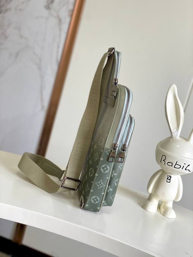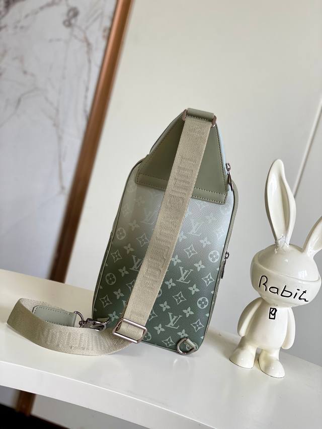 出厂价P 海原外单 独实家拍 动态芯片 M11702 胸包 Slingbag Pm 斜挎包采用 Monogram 绿渐变色帆布制成,Monogram 图案逐渐消失在背景中。颜色和精致的渐变传达出精致感。这款小巧的斜挎包有一个主隔层和一个外部拉链口袋,以及一个三角形拉链口袋,带子与包相接