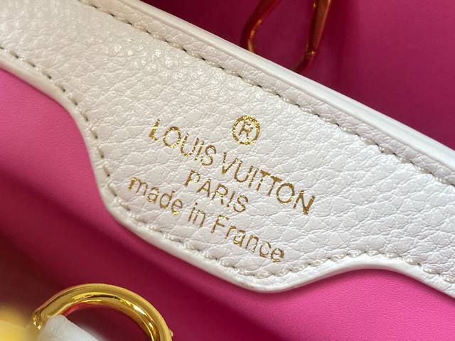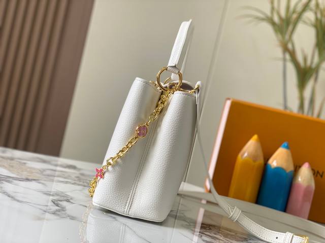 Capucines 中号手袋沐浴新季洗礼:金属 Monogram 花卉通过手工抛光和上釉显色,以精致链条串连。巧用可拆卸并调节的纤细肩带,探索更多背携方式。