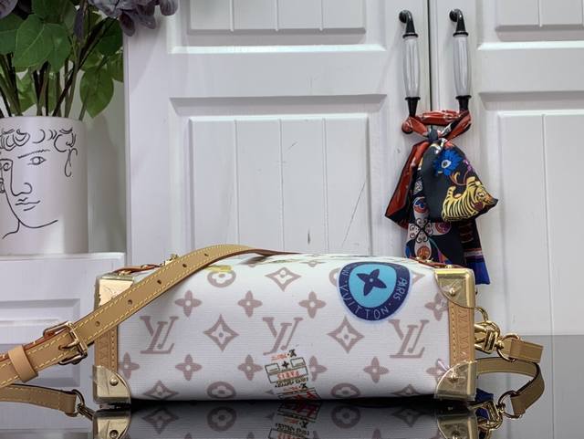 本款 Side Trunk 中号手袋出自 Flight Mode 系列,令 Monogram Dune 帆布呈现复古外观。轻盈构型点缀拼贴效果标签,耀目飞机挂饰和经典钥匙包丰富细节,牛皮革饰边致意品牌制箱传承。