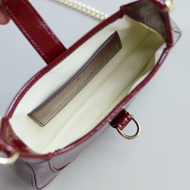 配全套原厂红色盒包装 新品 Jackie Notte迷你肩背包。这款全新Jackie Notte手袋由品牌创作总监Sabato De Sarno设计。它生动展现了品牌经典Jackie系列的自信底蕴,精心糅合全新廓形和精致细节,成就晚间造型的理想配饰。米白色漆皮、钩扣开合搭配浅金色调Gu字母链带,赋予这款迷你肩背包别具一格的时尚感。黑色漆皮,金色调配件,皮革衬里,内部:一个开口袋,饰Gu商标和手写体Jackie Notte字样,Gu字母链式肩带,每个字母均由手工固定,高54厘米,钩扣开合,重量:约0.35千