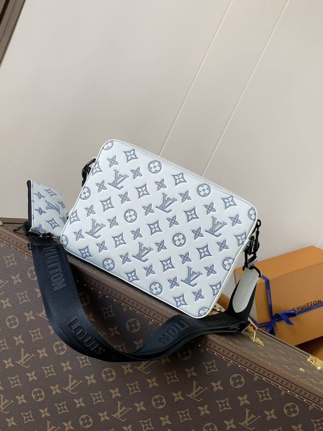 顶级原单 变码芯片 独家实拍 M24754米白 本款 Trio 邮差包取材 Monogram 压纹牛皮革,拉链前袋和肩带处的小号零钱包均可拆卸,与主隔层共同丰富功能设计。可拆卸并调节的提花织物肩带标注品牌标识,成就舒适肩背和斜挎体验。尺寸:25×18.5×7Cm