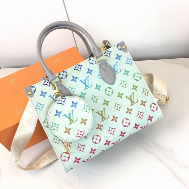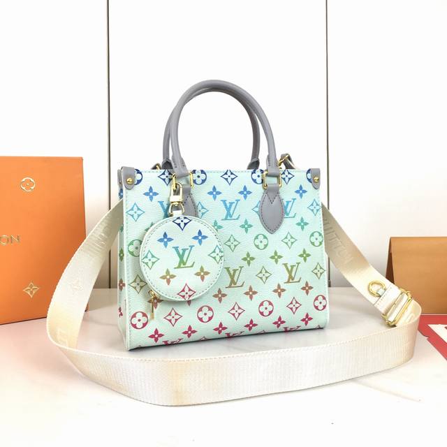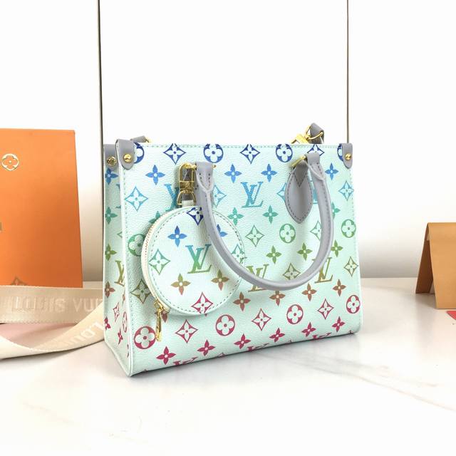 m46373彩虹渐变系列,独家实拍!本款 Onthego 小号手袋拼合 Monogram 和 Monogram Reverse 帆布,Monogram Gian