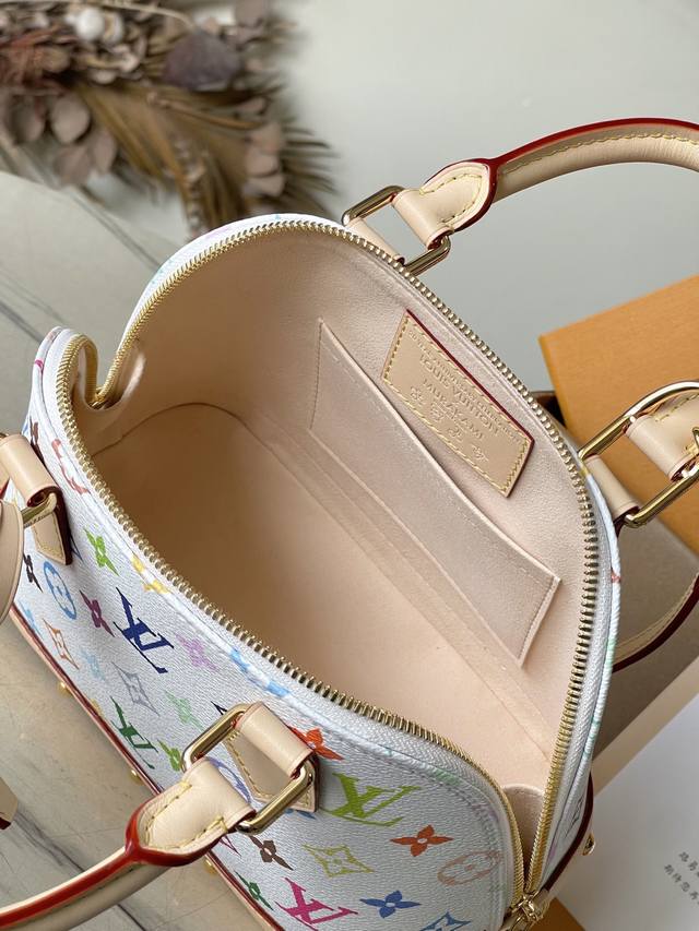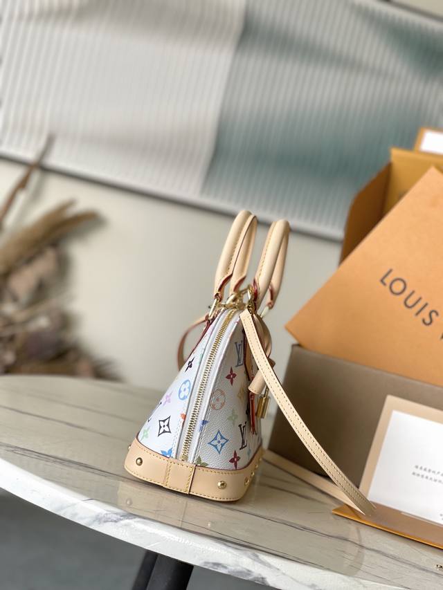 顶级原单M13078 本款Amabb手袋洋溢路易威登X村上隆合作系列的欢欣格调,巧妙回溯1930年代的装饰艺术风格设计。Monogram涂层帆布染村上隆笔下的谐趣色调,Toron手柄、包底、可拆卸肩带和L钥匙包融入经典牛皮革元素。尺寸:23.5 × 17.5 × 11.5 Cm