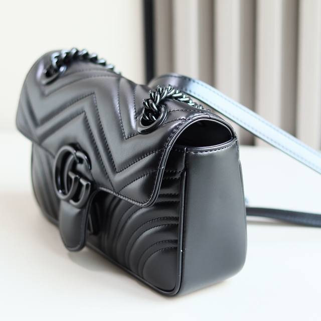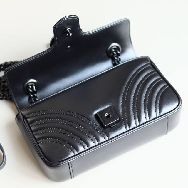 Gg Marmont系列金属链迷你肩背包,结构柔软,超大翻盖点缀双G配件。全新色系采用绗缝V形皮革,搭配配有单色调配件。滑链肩带设计精巧,背法多样,可在肩背和手提之间自由转换。