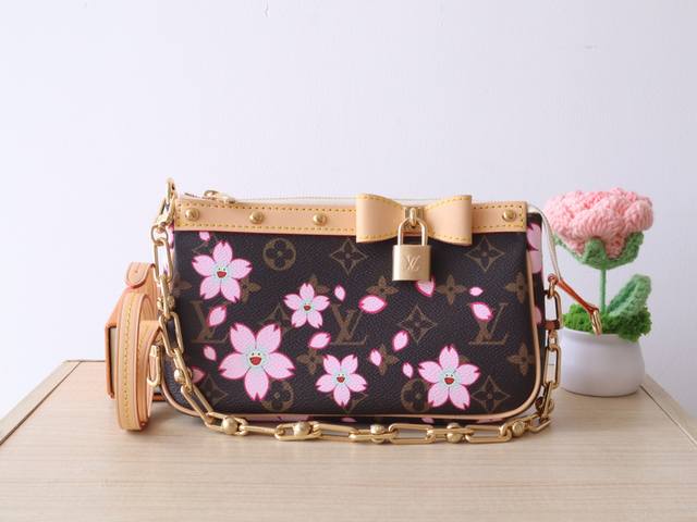 本款 Pochette Accessoires 手袋为经典 Monogram 帆布融入村上隆笔下的明媚 Cherry Blossom 图案,以玩趣格调道出路易威登 X 村上隆复刻系列的鲜明元素。皮革蝴蝶结与 Lv 铭纹挂锁点亮上缘,耀目饰钉与可拆卸链条注入一丝不羁气息。13 X 4 X 22 厘米