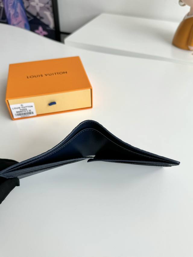 工厂P价 海外原单M69075宝蓝独家实拍!精致柔软的Taurillon皮革是钱夹的理想材质。 这款钱夹外型紧凑,却拥有多个口袋和卡槽,非常实用,可轻松放入任何