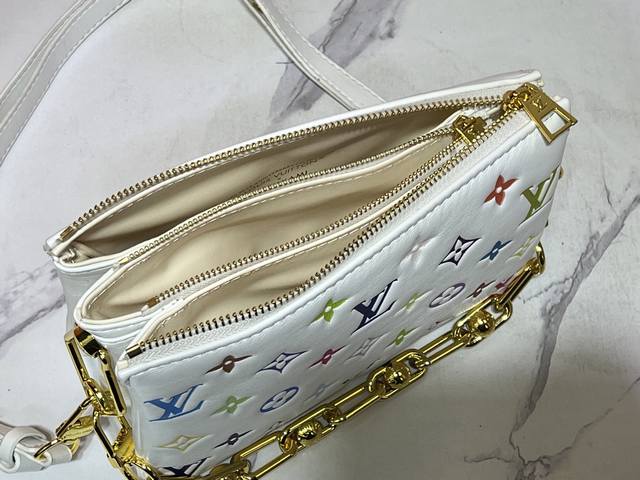 M59598 M13233 本款Coussin 小号手袋于 春夏时装秀大放异彩。Monogram 压纹蓬松羊纹牛皮打造靠枕构型,为简约设计注入前卫风范。可利用肩带斜挎或化身链条法棍包,亦可于腋下携带。尺寸21.16.7Cm