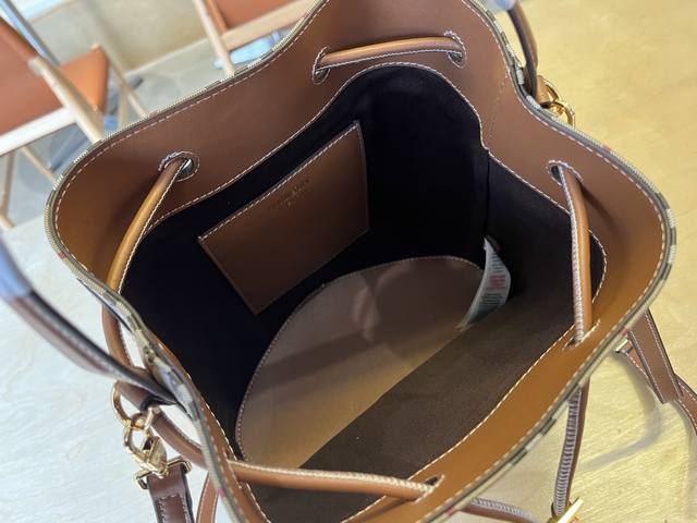 / b家最新水桶包,选用大号格纹与缉明线皮革材质打造,装饰品牌 Tb 专属标识。此包款为 Tb 包系列新成员,搭配可拆可调式斜背肩带,设有内袋,可供存放小件随身物品