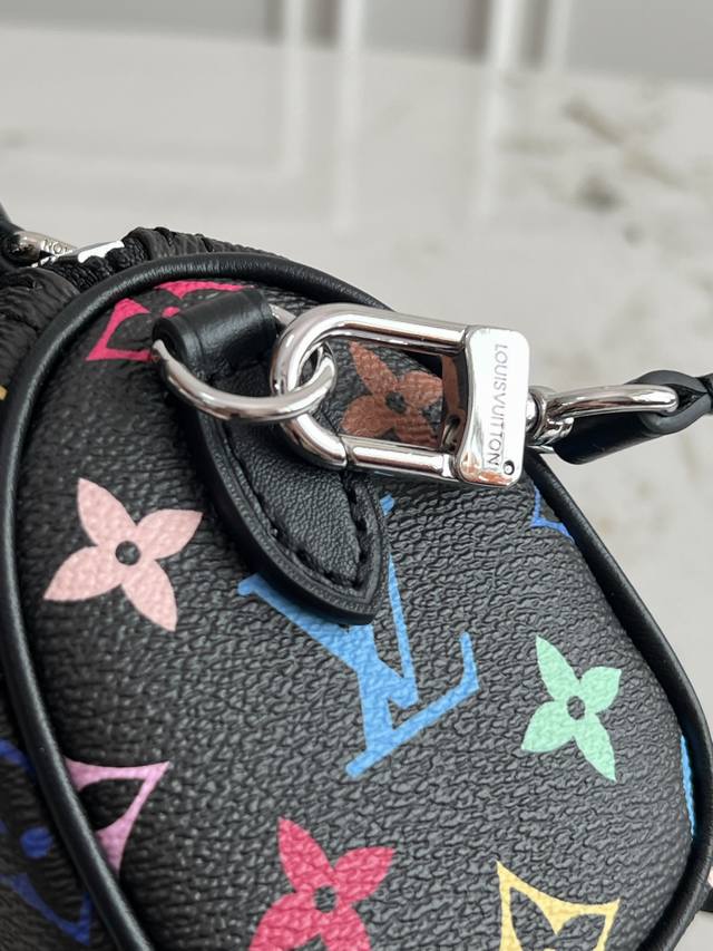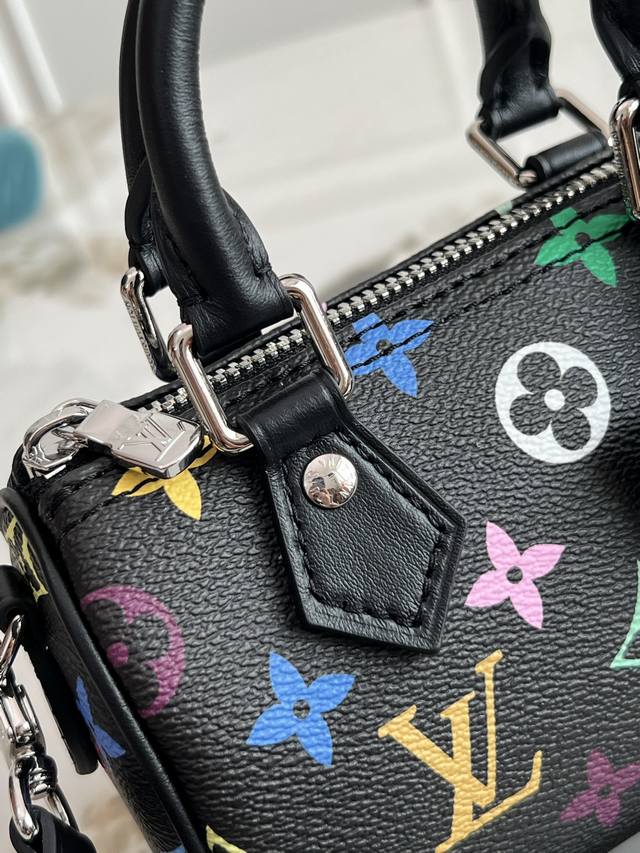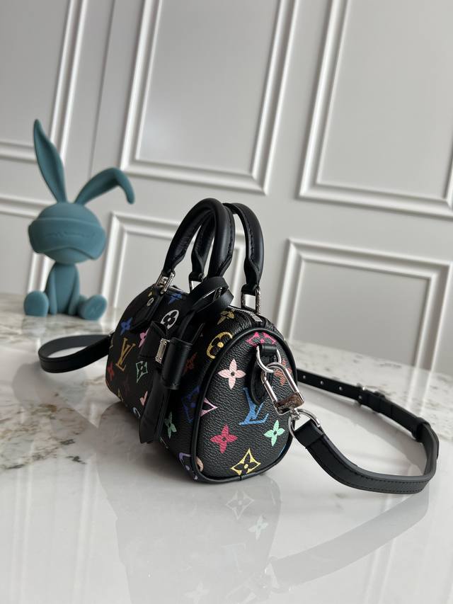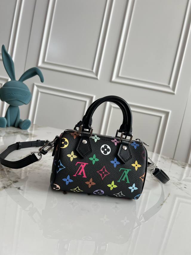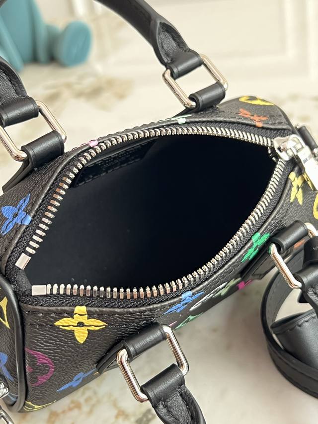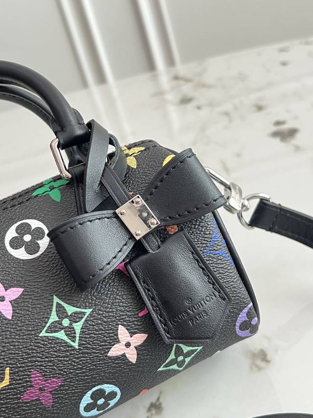 本款 Nano Speedy 手袋选用 Monogram 涂层帆布和牛皮革饰边塑造玲珑构型,以明丽色彩演绎路易威登 X 村上隆再版系列的灵动格调。Toron 手柄和耀目挂锁致敬品牌旅行传承,可拆卸并调节的肩带和别致 Lv X Tm 钥匙包完善整体。