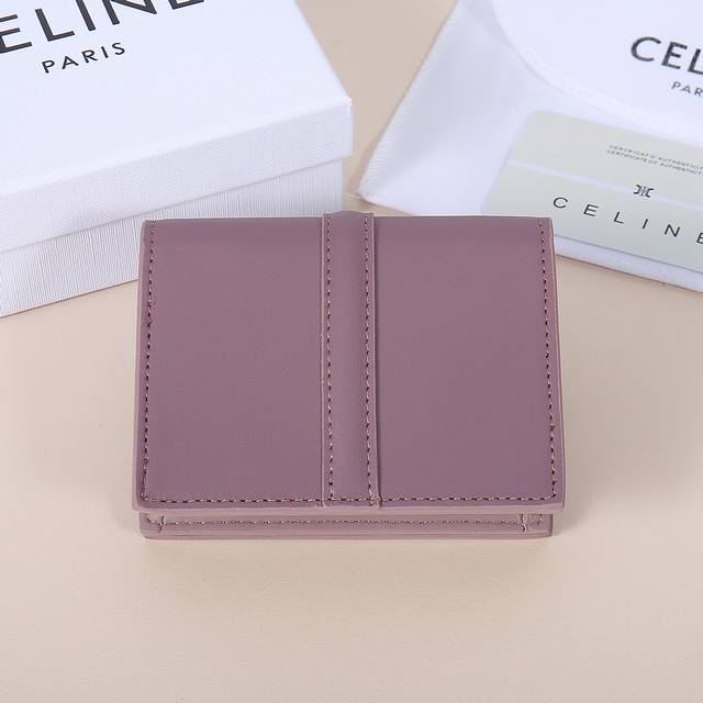 Celine新款卡包,Triomphe翻盖卡包,牛皮大面内配平纹超纤,旋转锁扣开合,1个加厚主隔层,2个内侧卡槽。