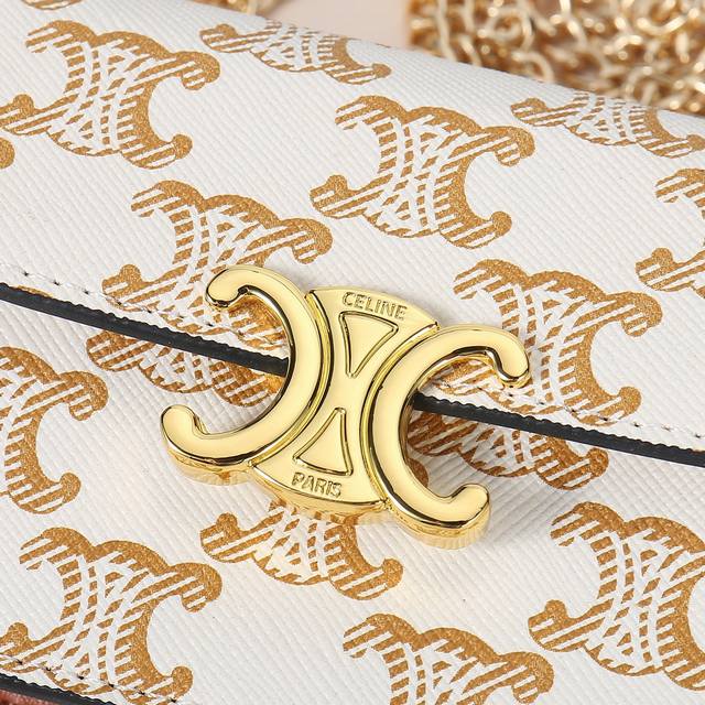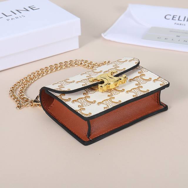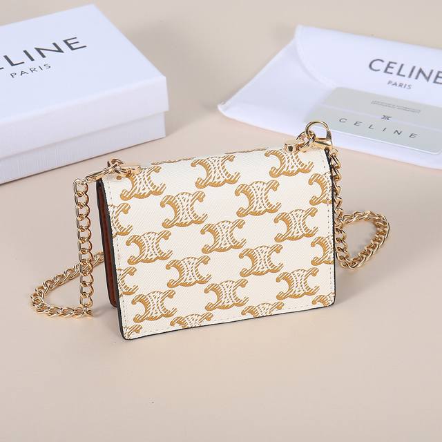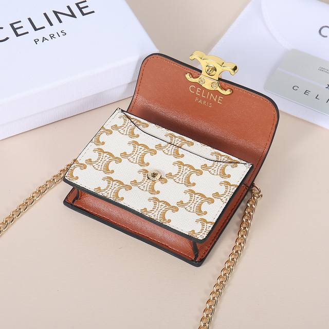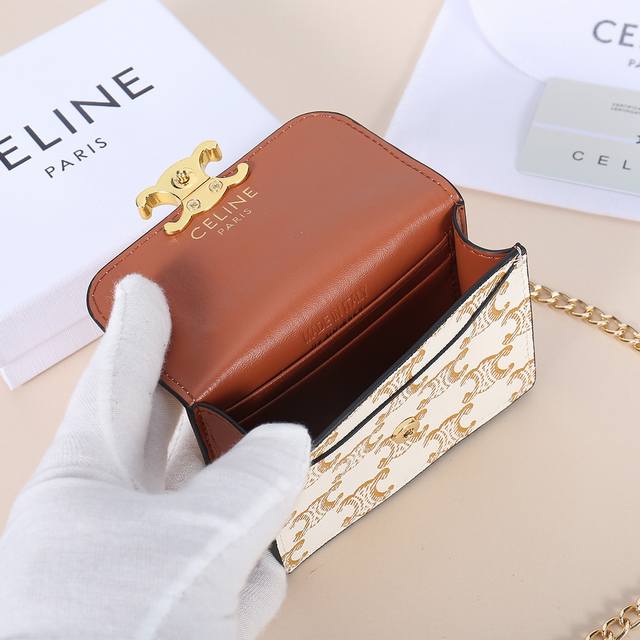 / celine新款链条Triomphe名片包,可斜挎,经典花纹大面内配平纹超纤,金色饰面Triomphe金属按扣开合,1个加厚主隔层,3个内侧卡槽。 编号:10N