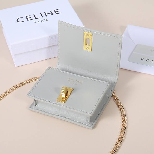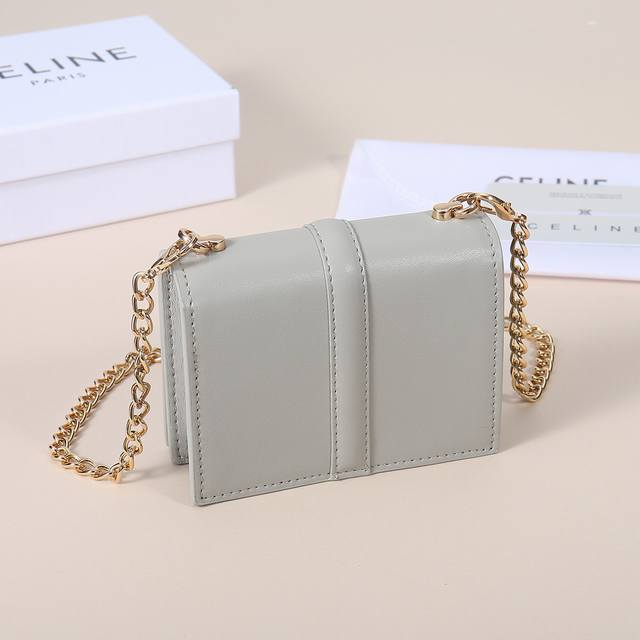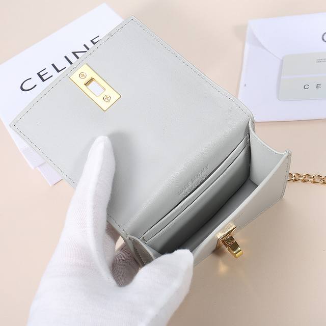 Celine最新链条卡包,Triomphe翻盖链条卡包,可斜挎,经典牛皮内配平纹超纤,旋转锁扣开合,1个加厚主隔层,2个内侧卡槽。