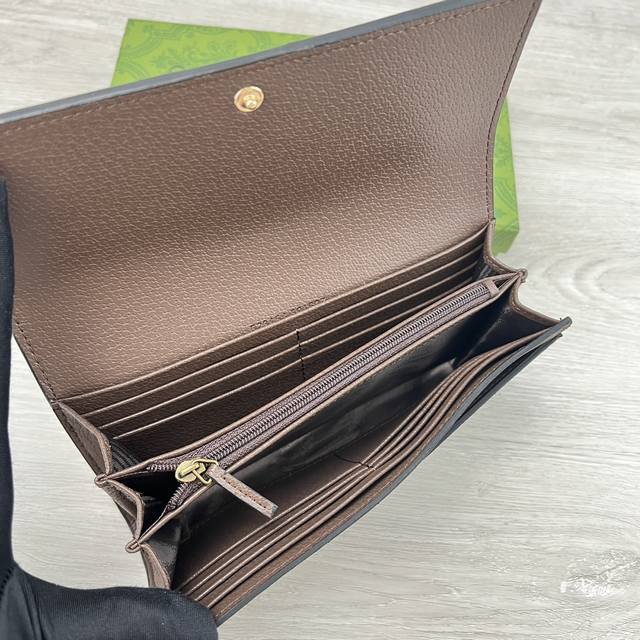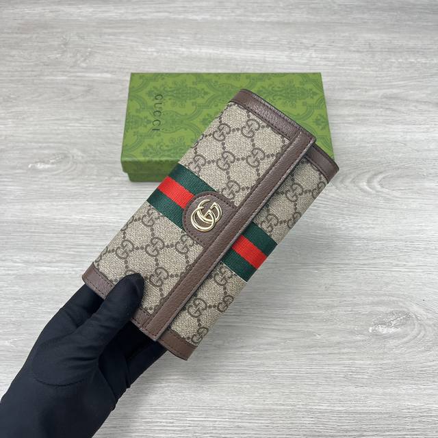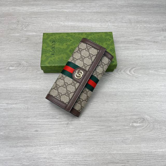 官网同步新款!Ophidia系列~两折长夹,采用Gg Supremepvc面料配以标志性双G 五金唛头,经典著作红绿色织带,精制而成!款号:523153, 尺寸