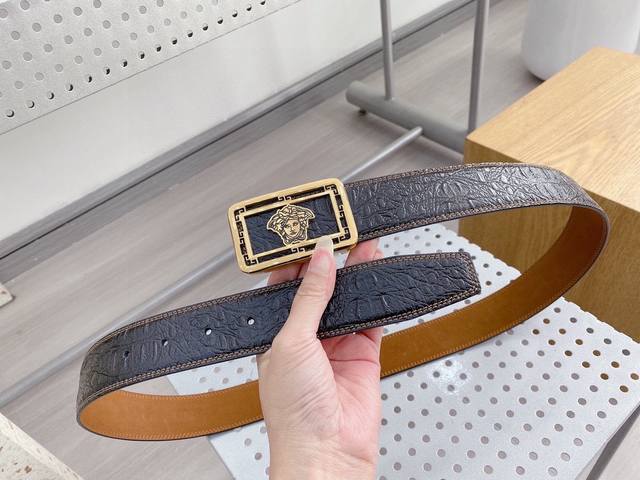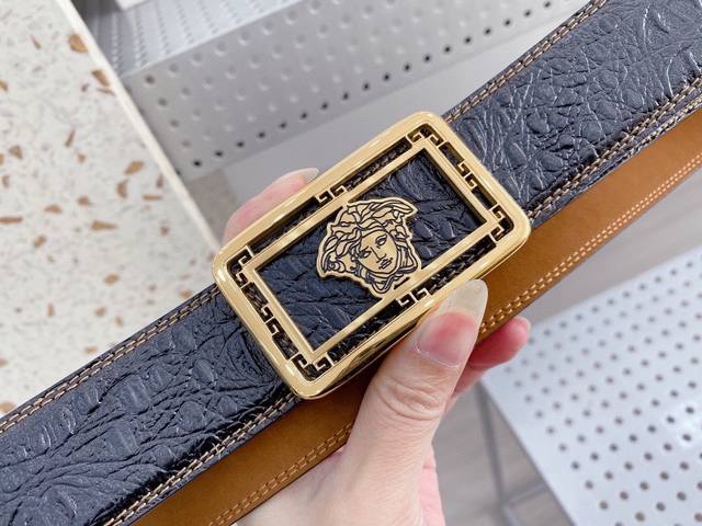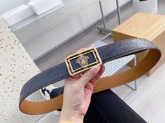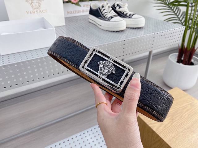 范思哲 原单专柜1:1秘新款扣头搭配双面进口皮腰带采用意式缝线 提升了皮带本身的档次带头精钢打磨 不褪色宽度3.8工艺精湛 结合原单支持验货! 附带原版包装