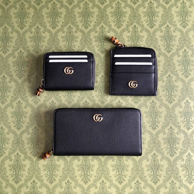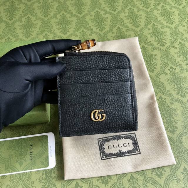 / 顶配版 新款黑色皮革卡片夹采用别致的竹节锁扣设计,突显Gucci设计美学中对材料的灵活运用。卡片夹设有外部卡片隔层和一个拉链袋,金色调双G字母交织图案配件为整款