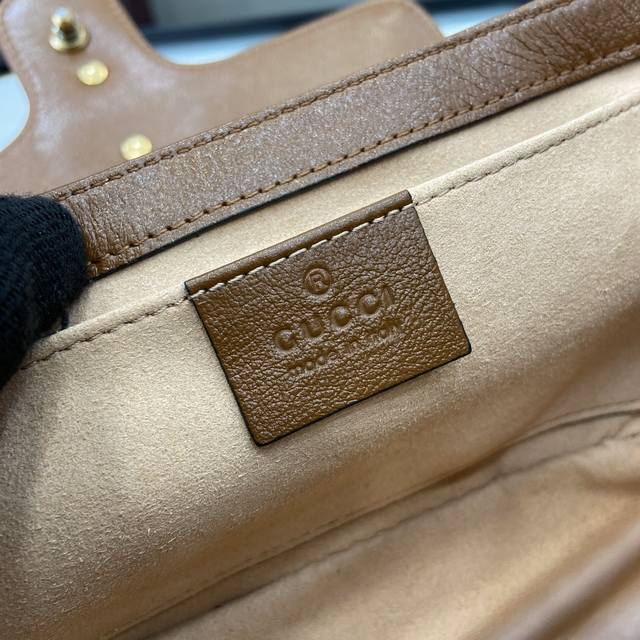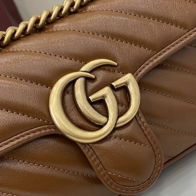 配全套原厂绿盒包装 原厂皮 新品 Gg Marmont系列绗缝迷你手袋 这款Gg Marmont系列迷你手袋采用高辨识度造型 中性棕色绗缝V型皮革材质 包身略显挺括 翻盖开合设计 配有双G配件 这款手袋采用了多样化背法设计 轻松滑动金属链即可在肩背包与手提包之间自如切换 棕色绗缝V型皮革 金色调配件 绒面材质超细纤维衬里双G 滑链包带可作为肩带 55厘米高 或顶部提手 30厘米高 使用 也可作为斜挎包使用 弹簧扣翻盖 重量 约0.6千克