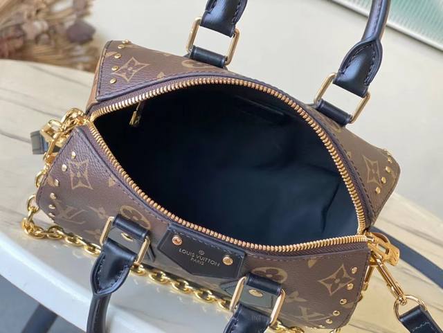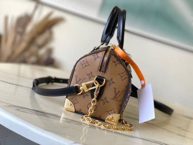 钢五金 顶级原单 M13146 Speedy Trunk手袋以大胆理念重构经典设计 瞩目亮相2025 Cruise早春秀场 Monogram 帆布搭配Monogram Reverse饰边 展现Nicolas Ghesquiere的标志性笔触 耀目金属件致敬品牌悠远制箱传承 肩带和链条均可拆卸 斜挎 肩背或手提皆宜 尺寸 20.5 16 11 Cm