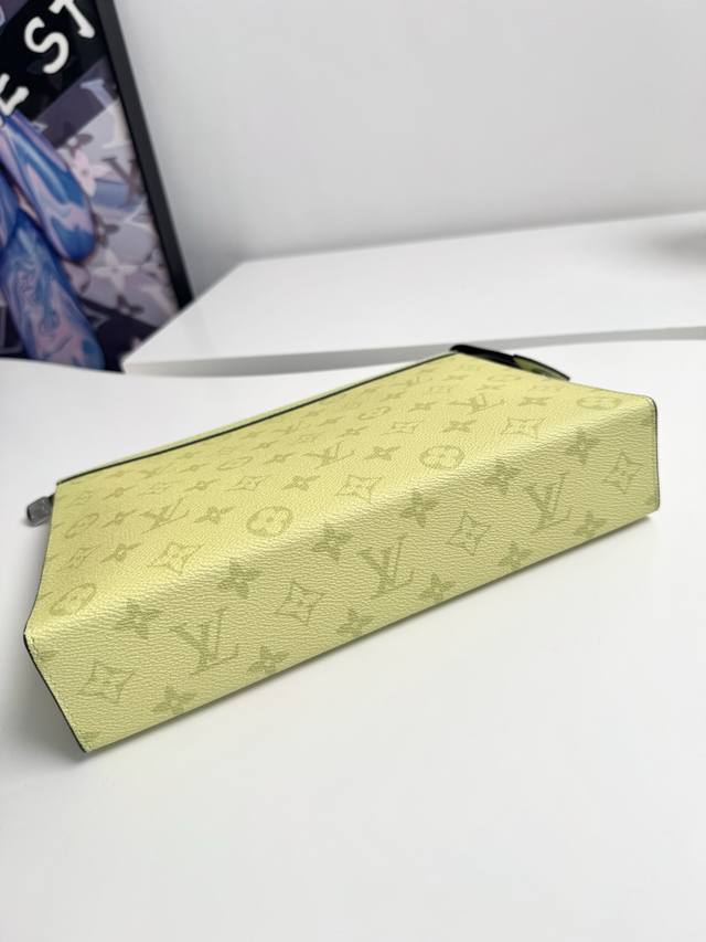 海外原单M61692浅黄独家实拍 此款小巧而时髦pochette Voyage中号手包 功能多样 既可作为旅行袋放于包中 亦可持于手中 展现时尚风格 宽敞的包内空间加上撑板设计 方便取用私人必备品 尺寸 26 20 5Cm