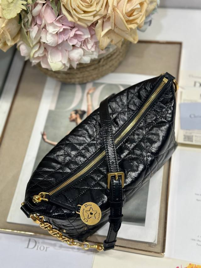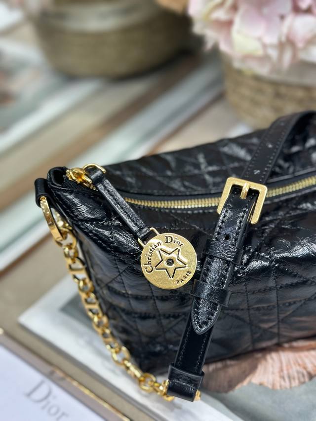这款Diorstar Hobo 链条手袋是二零二四春夏成衣系列新 品 造型时尚 设计实用 廓形柔软 采用黑色油蜡皮精心制作 饰以超大藤格纹 带有宽敞的隔层 拉链开合 搭配 镇刻以 Christian Dior paris 标志和 Dior 经典星星标识的圆形 饰牌 侧面饰以精致的 Cd 铆钉 更显格调 内部带有绒面 牛皮革里料 配有卡槽 搭配可调节的 Cd 链条肩带 并带 有皮革带 提升肩背时的舒适度