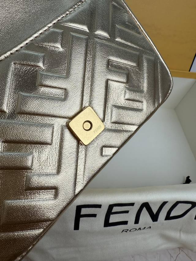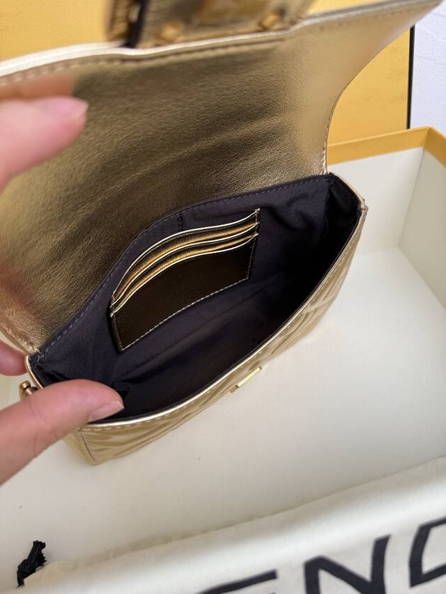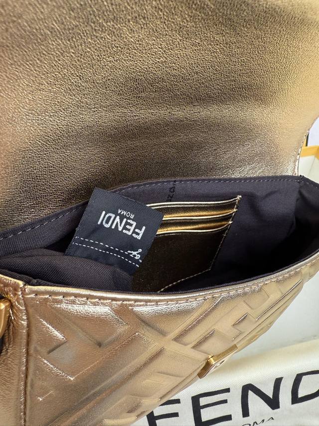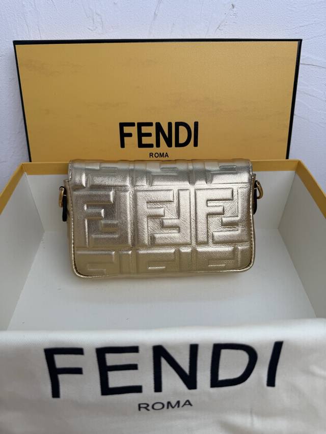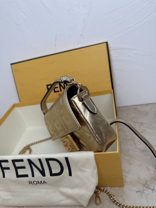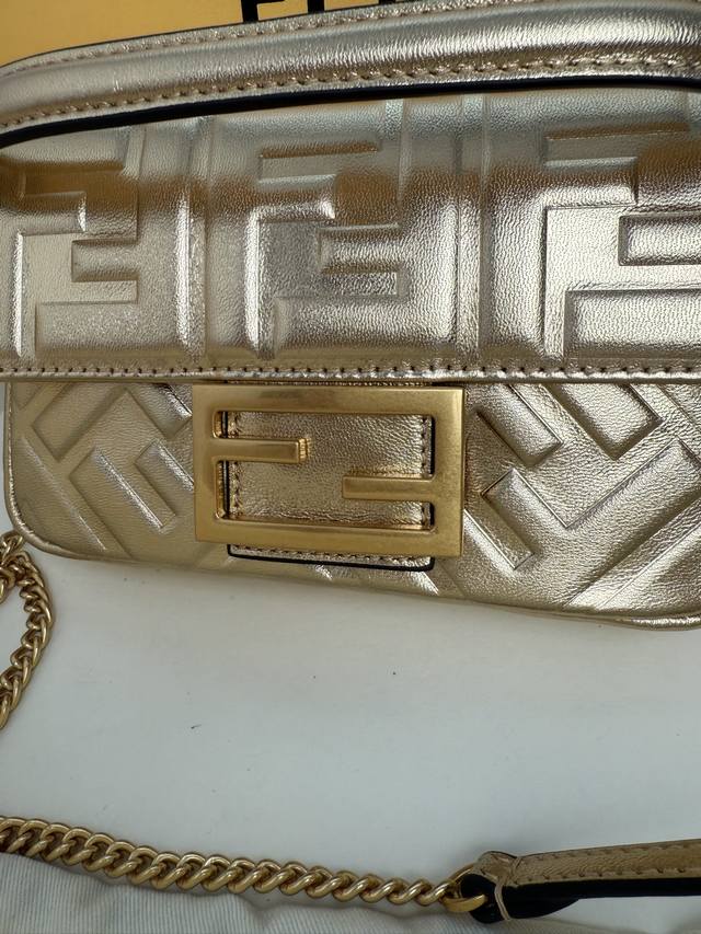 iconic Baguette迷你手袋 纳帕软皮革材质 饰有三维纹理Ff图案 缀以Ff搭扣 设有正面翻盖 磁扣 带衬里的内部隔层 口袋和金色金属件 手袋配有可拆卸式手柄和链式肩带 可手提 肩背或斜挎