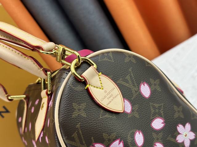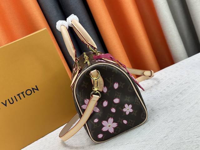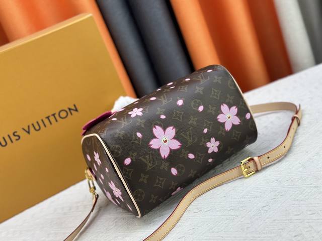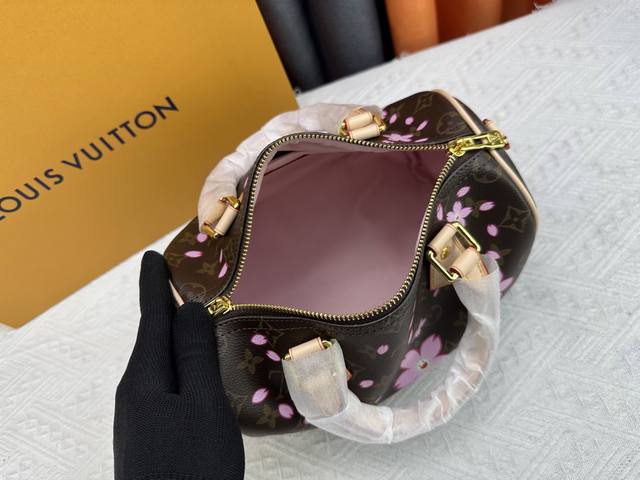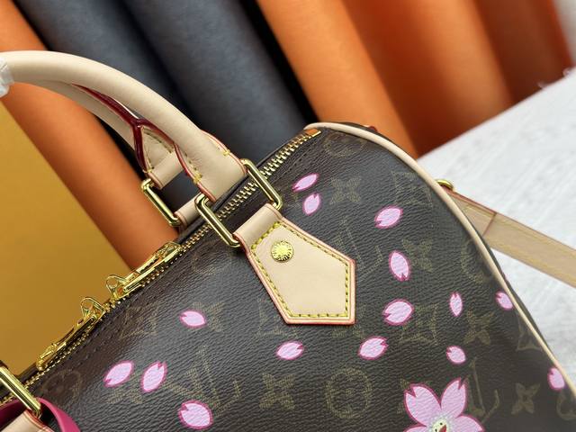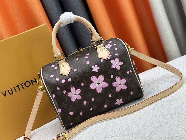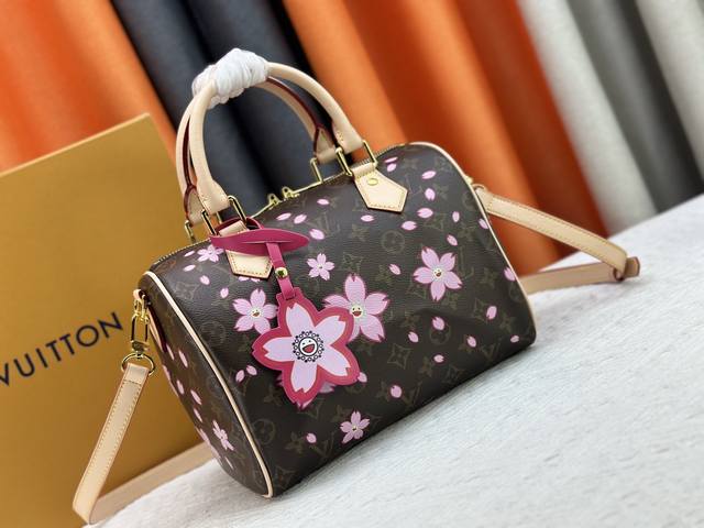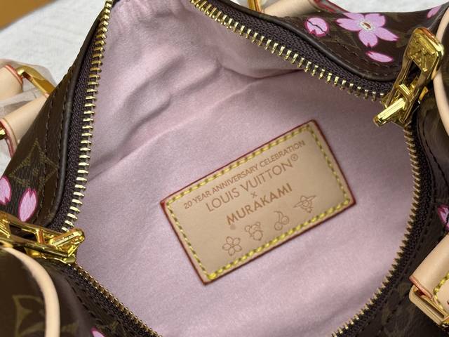 M14174 本款 Speedy Bandouli Re 25 手袋出自路易威登 X 村上隆复刻系列 为品牌经典 Monogram 涂层融入村上隆笔下灵动的 Cherry Blossom 图案 再令相同元素延续至可拆卸包饰 牛皮革构筑 Toron 手柄与可拆卸皮革肩带 双拉链和挂锁确保个人物品安全无虞