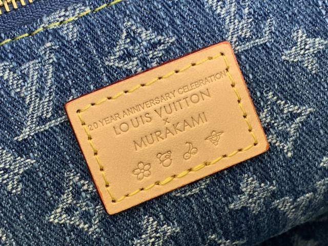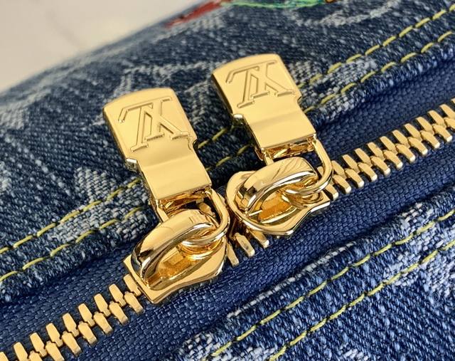 化妆品袋Gm是Monogram牛仔布的必备品 饰有卡哇伊樱桃刺绣 作为跨类别路易威登X村上隆美系列的再版的一部分 金色铆钉为天然皮革装饰增添了叛逆的触感 而超宽的拉链开口和可拆卸的可清洗衬里突出了实用性