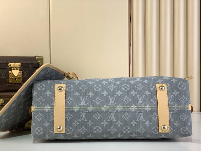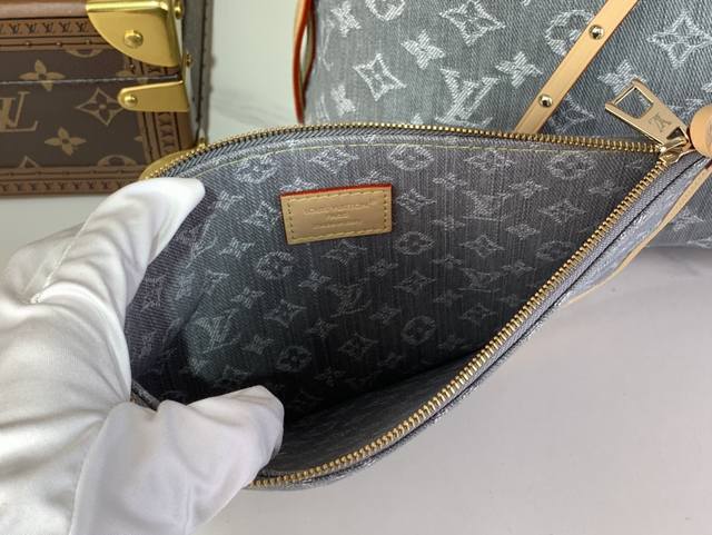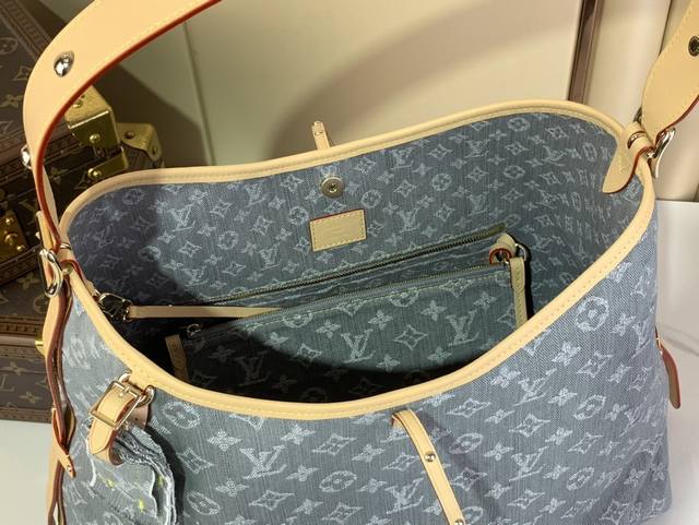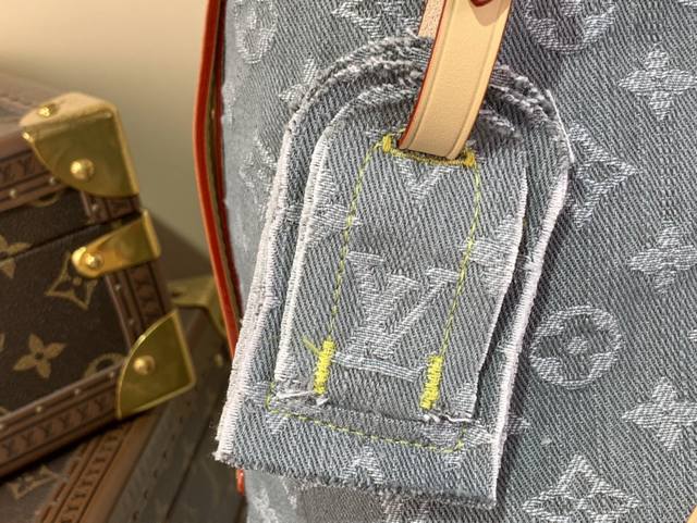 本款 Carryall 中号手袋令诞生于 2005 年的 Monogram Denim 图案栖身棉布表面 再以路易威登精湛漂白工艺营造水洗效果 撞色皮革和可拆卸名牌烘托利落构型 拉链内袋可稳妥收纳贵重物品 成就畅行都市的摩登之选