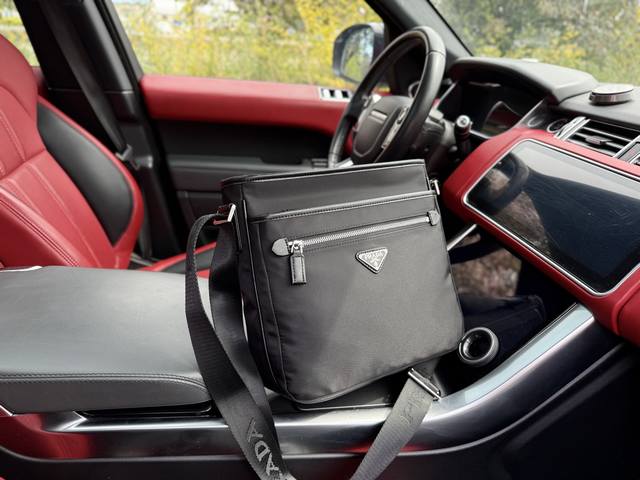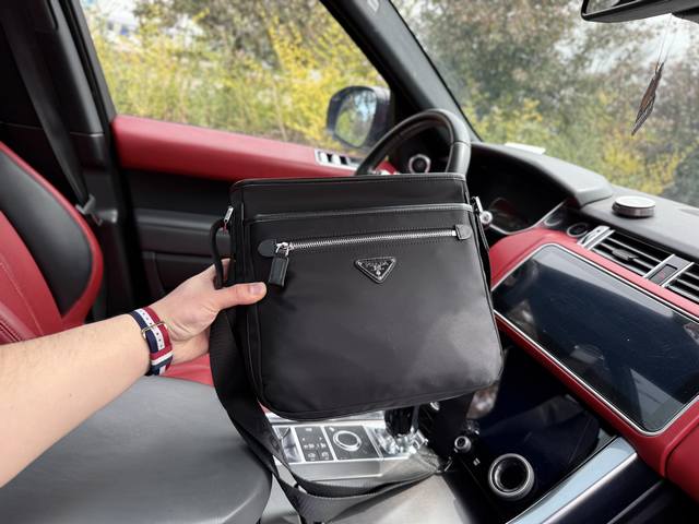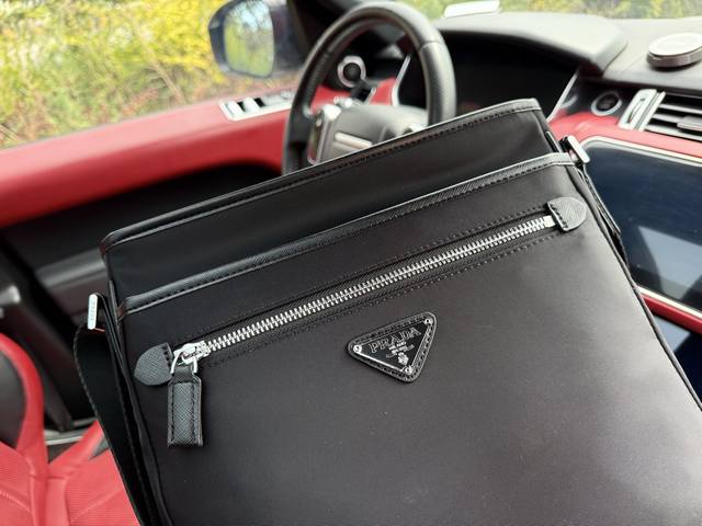 高端货 最新款 prada 普拉达单肩包普拉达邮差包斜挎包 字母Logo徽标可调节肩带Saffiano皮革邮差包单肩斜挎包 男款 黑色 尼龙和Saffiano 皮革斜挎包尼龙材质金属配件和钛金属拉链prada徽标织物衬里两枚旁开扣 正面三角形珐琅徽标这款摩登时尚的单肩包配有可拆卸的小袋挂饰和空间宽大的内部隔层 彰显功能性 顺滑拉链 专用内里 高清五金标识 规格 26X26X8Cm