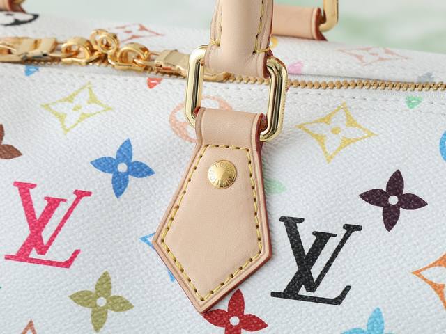顶级原单 独家实拍 M13085白彩 Speedy枕头包 本款 Speedy Bandouli Re 25 手袋为经典 Monogram 图案渲染日本艺术家村上隆笔下的明丽色调 与蝴蝶结造型钥匙包一道彰显路易威登 X 村上隆合作系列的灵动风采 牛皮革塑造 Toron 手柄和可拆卸并调节的肩带 耀目挂锁和包角援引品牌行李箱元素