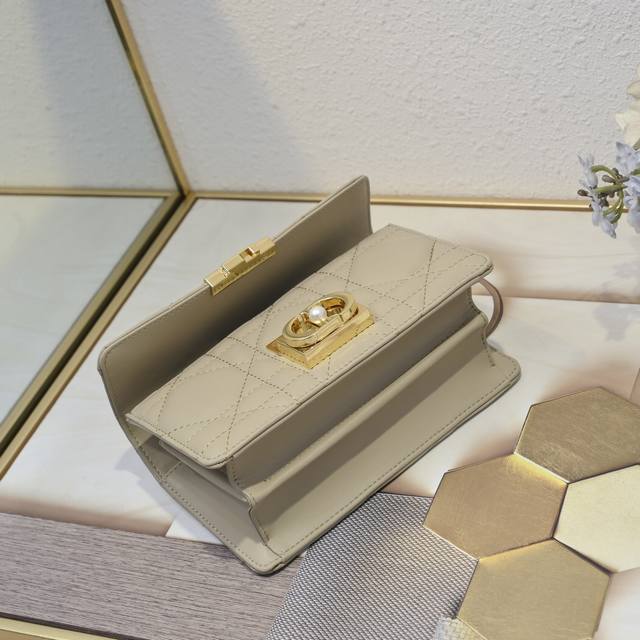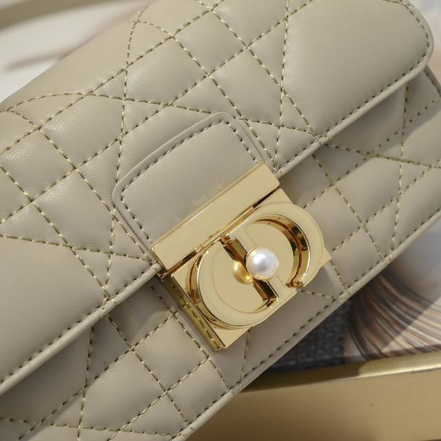 christian Dior paris标志 翻盖饰以树脂珠饰点缀的Cd扣环 缝有三角形衬料的廓形 搭配两个宽敞的隔层和一个插袋 可收纳各种日常用品 设计高雅 可调节 可拆卸的链条肩带由点缀以树脂珠饰的金色饰面金属Cd链环组成 可手提 肩背或斜挎