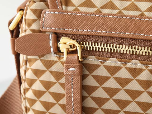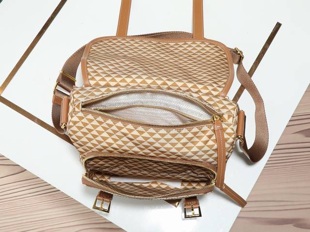 这款邮差包采用织物印花尼龙面料 配十字纹牛皮 颜色吸睛夺目 包包上的印花由经典三角形组成 很耐看哟 空间大 真太太美了 美女们 赶紧入手吧 春夏季节必备