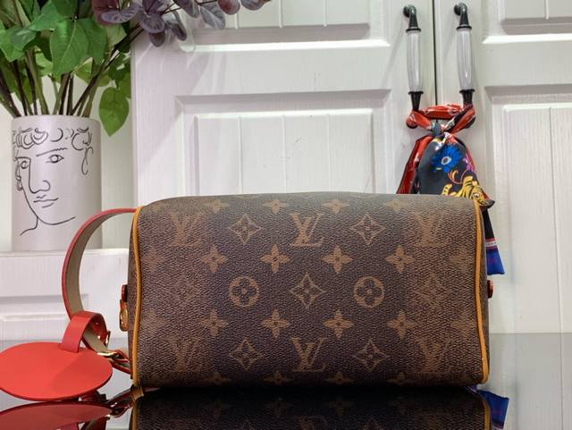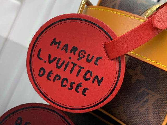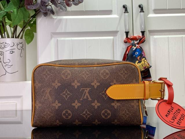 本款 Locker Dopp Kit 盥洗袋以 pharrell Williams 的 Monogram Dust 帆布释放品牌经典魅力 借褪色效果 Monogram 图案 做旧牛皮革饰边和手柄娓娓道出标志性格调 可拆卸吊饰点睛细节 其上呈现 Marque D pos E 标识