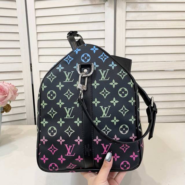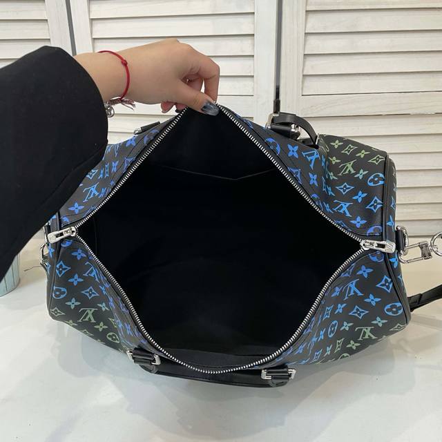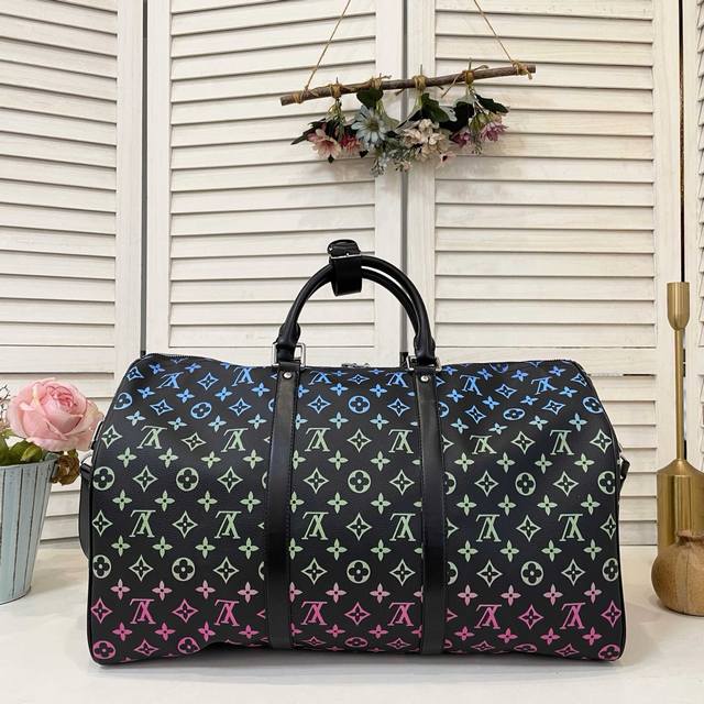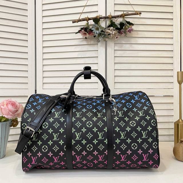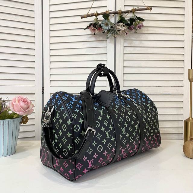 旅行袋系列 Keepall Bandouli Re 50 旅行袋 渐变黑三彩 本款 Aly Keepall Bandouli Re 50 旅行袋取材柔软 Epi Soft Xl 牛皮革 呈现传统 Epi 压纹的放大版本 顶部手柄结合可拆卸并调节的肩带 成就舒适背携体验 尺寸 50 X 29 X 23 厘米