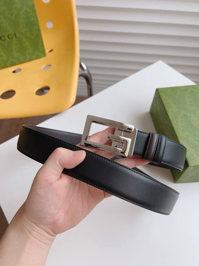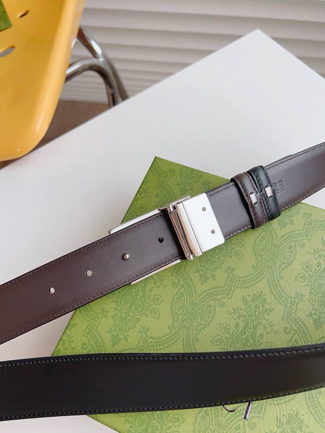 Gucci 黑棕两色双面小牛皮腰带 配饰继续引领Gucci全新系列的潮流 以独具匠心的丰富细节和实用功能演绎出众品质 经典的方形G搭扣元素令整款腰带更添魅力 皮带宽度3.5Cm