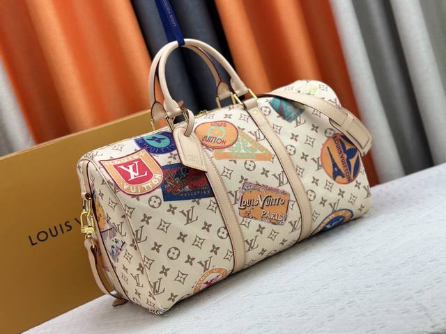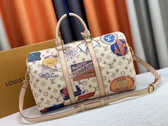 M41418 M14736 本款用单体画布缝制的 基波尔45 Louis Vuitton旅行贴纸包 营造出华丽的氛围 是任何旅行者的完美选择 进一步提升复古风的魅力的嫩革修剪也很有魅力 可随机携带的行李 根据航空公司和所使用的设备而异 带有两个顶部手柄和可拆卸和可调节的肩带 可享受多种携带方式