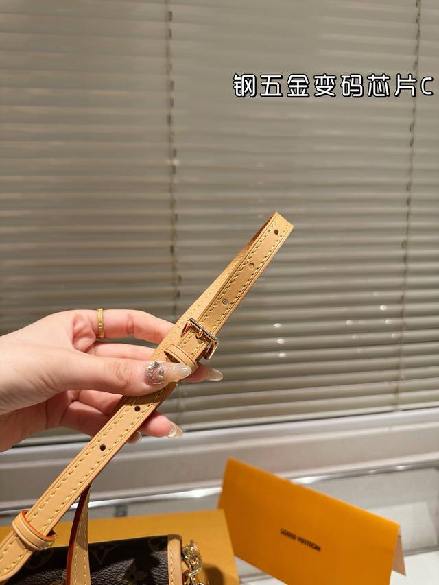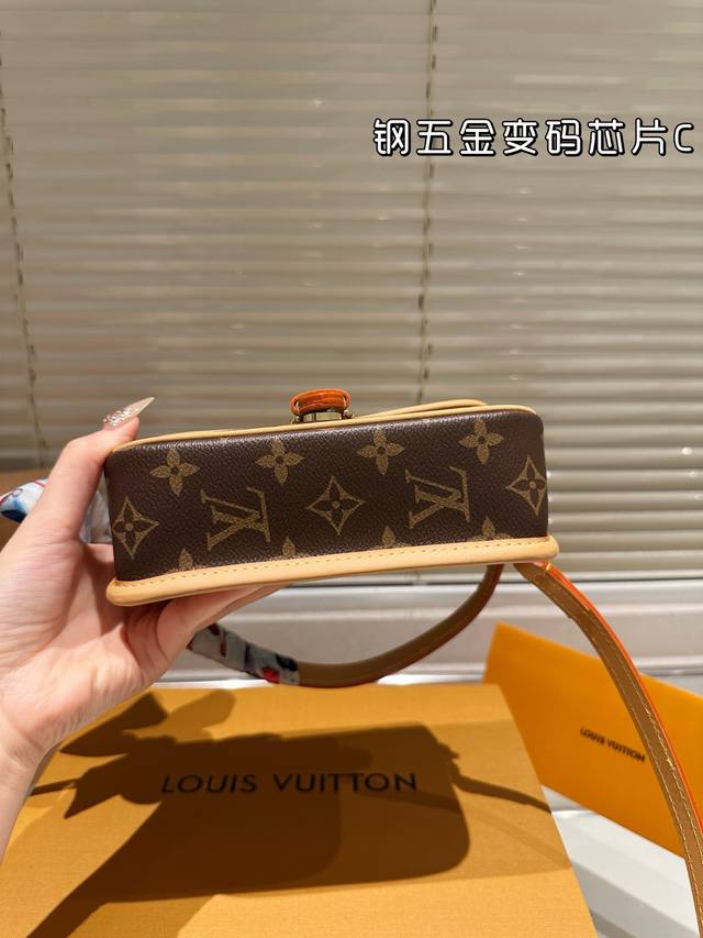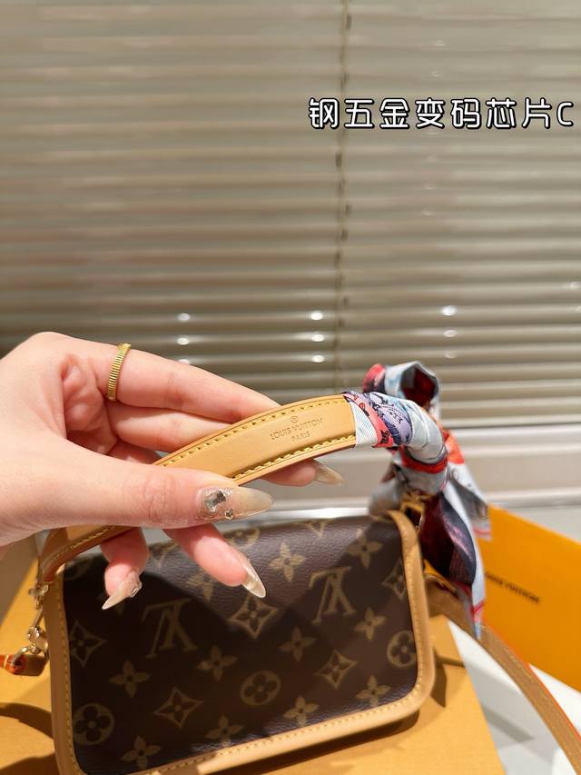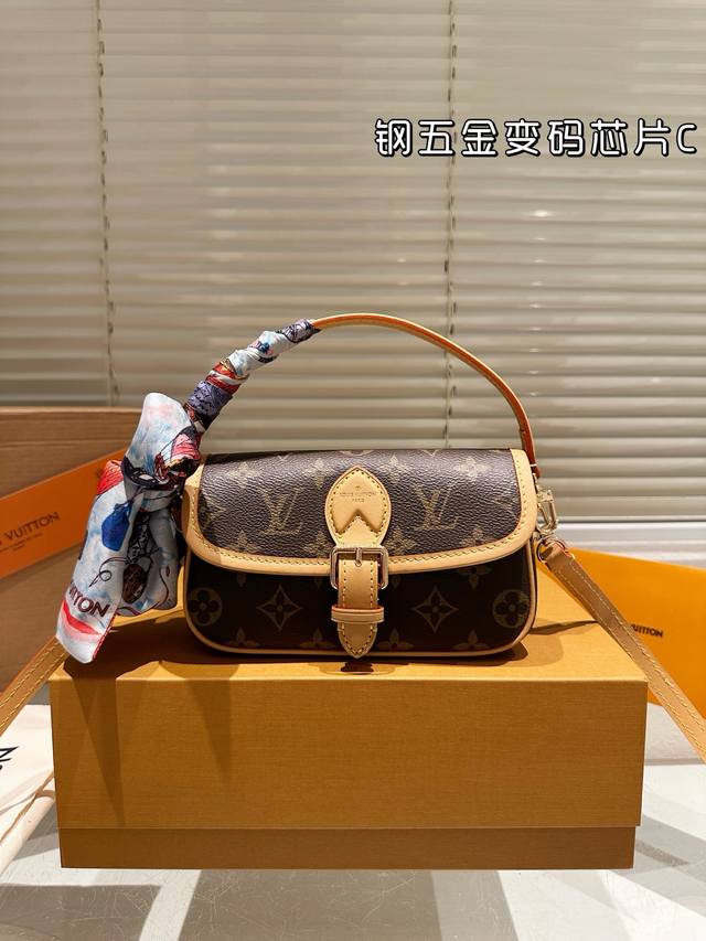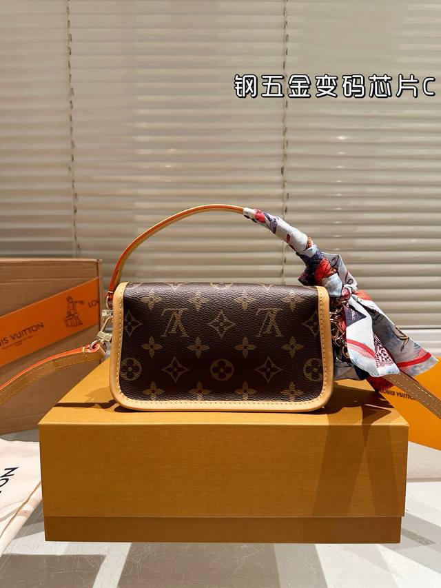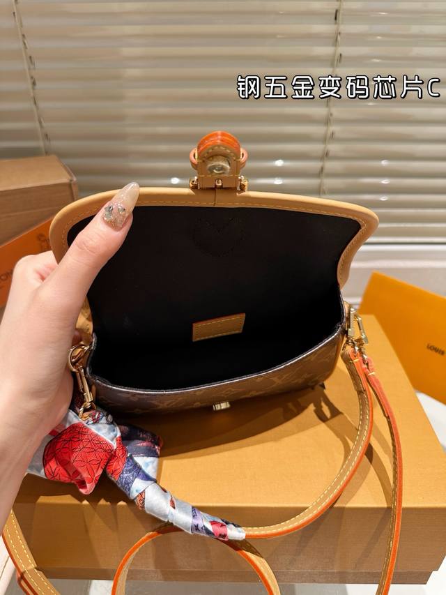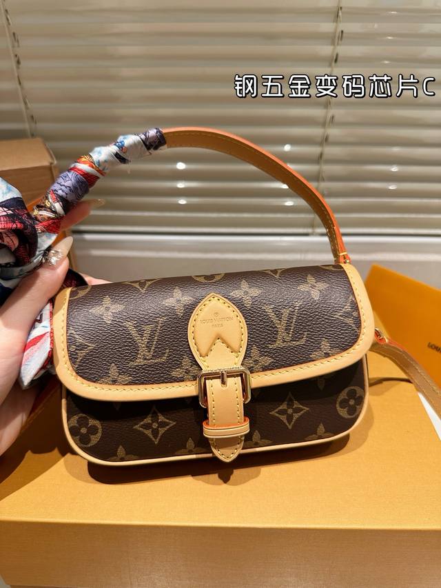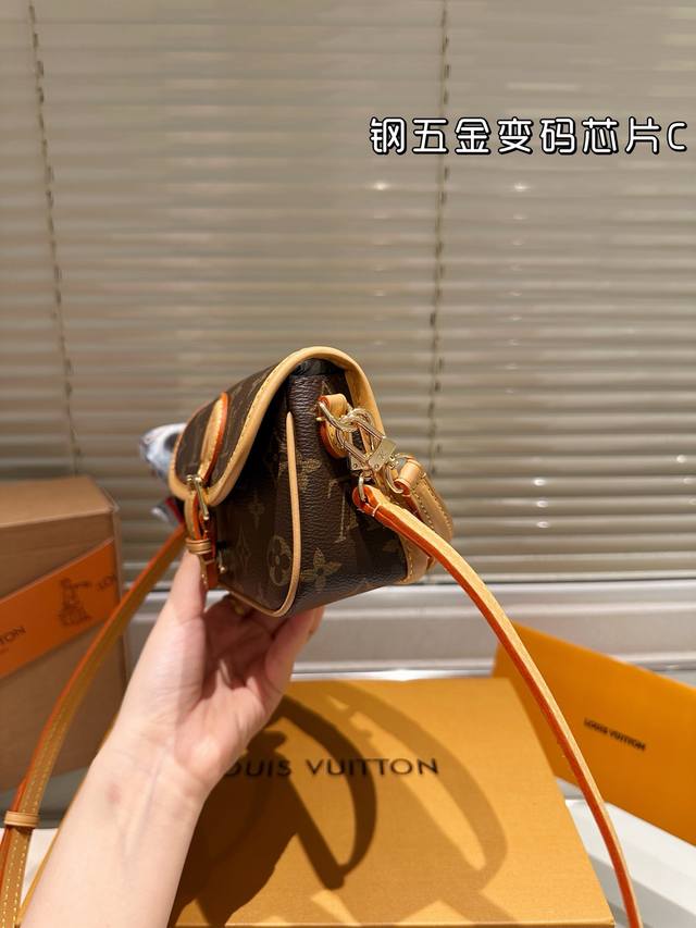 本款Nano Diane为Monogram帆布包身融入皮革包角和传统搭扣等复古元素 复现圆润翻盖和腰带式开合等原型细节 充裕空间可收纳手机和日常所需 可拆卸手柄和可拆卸并调节的肩带实现灵活背携 昼夜场合皆宜