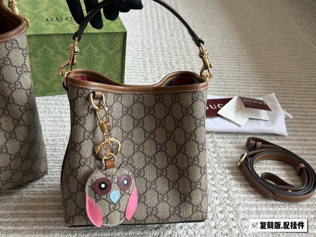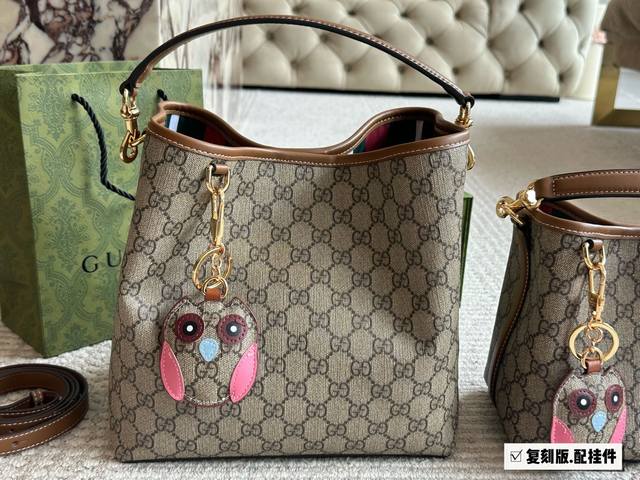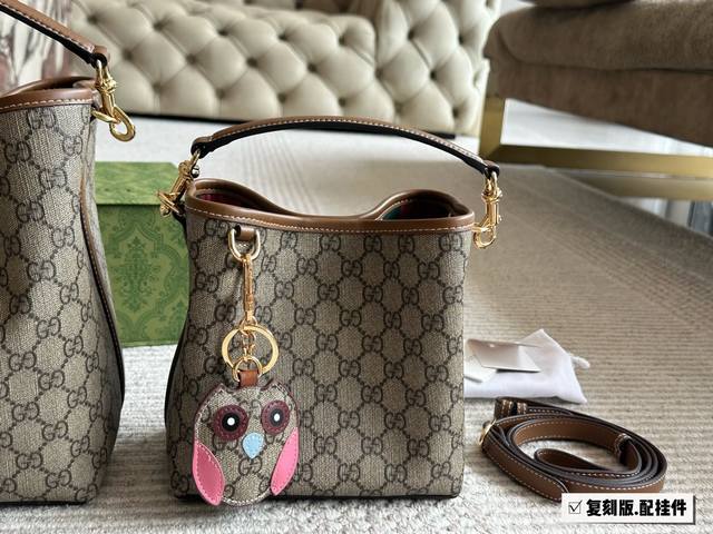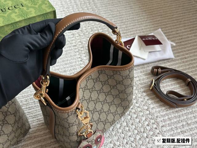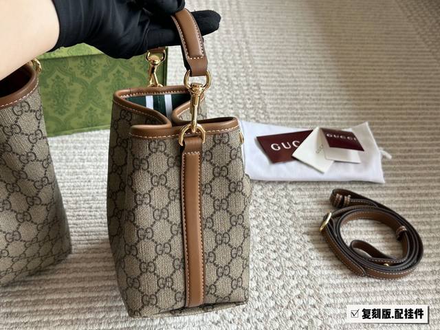 全新 系列焕新诠释品牌的隽永优雅风范和精湛工艺 这款水桶肩背包尽释实用设计美学 两个主隔层采用织带棉布衬里 中央设有一个拉链口袋 米色和深棕色全新Gg字母图案涂层织物棕色皮革滚边 饰对比色缝线红绿织带棉布衬里