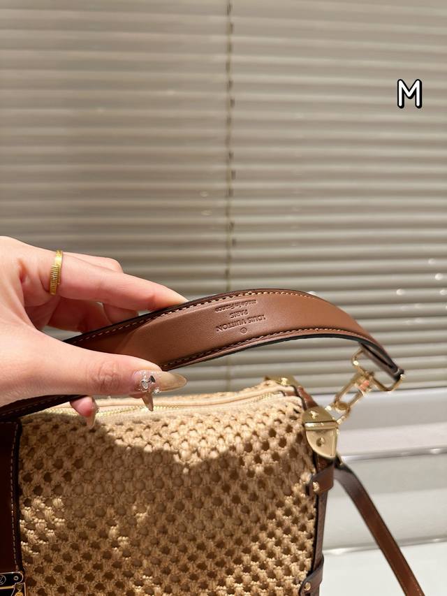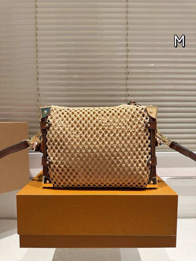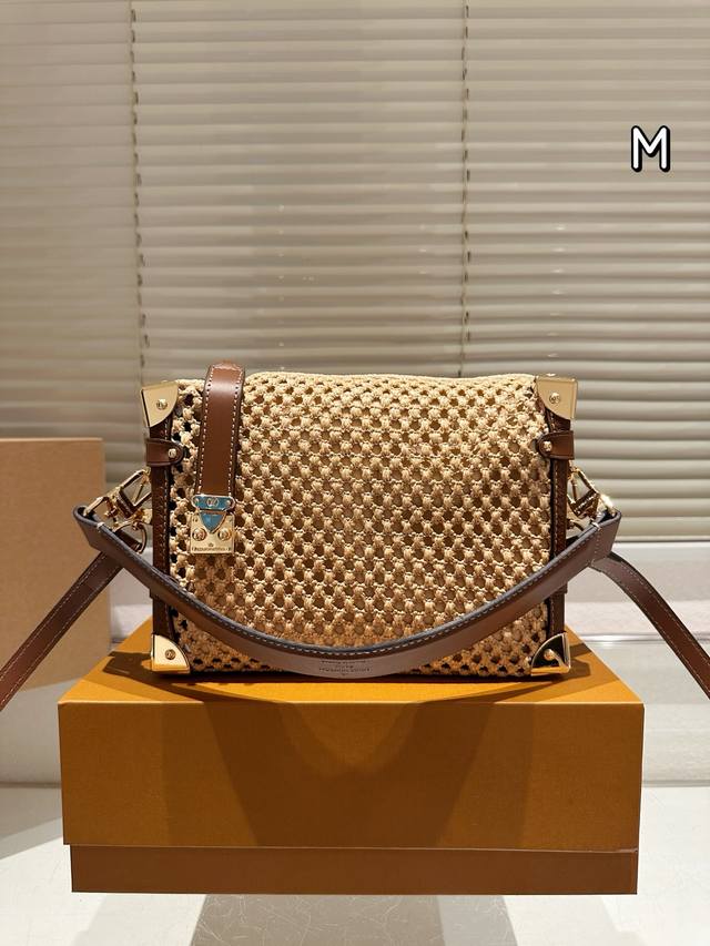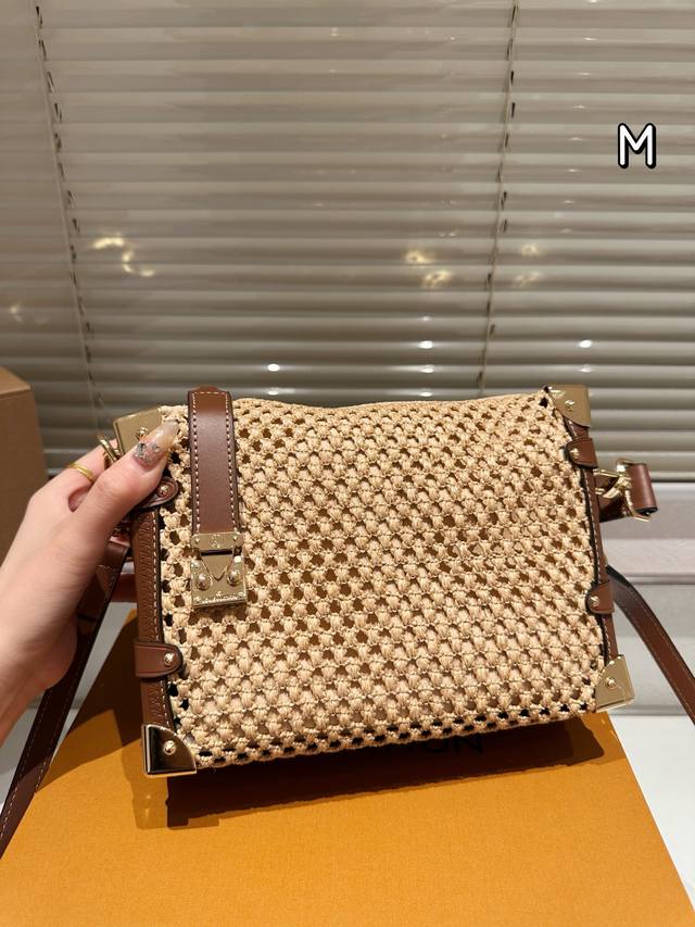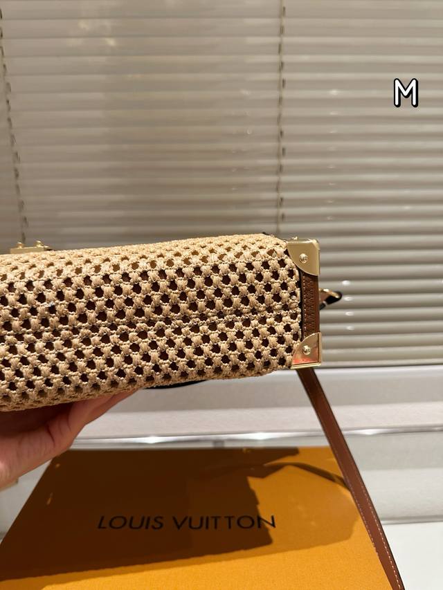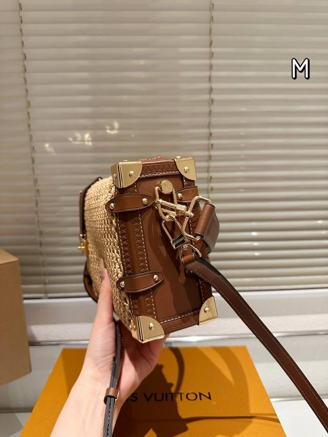 原单版本 配皮 lv 谷爱凌Trunk手袋为Monogram拉菲草搭配亮泽金属件 可调节肩带延续品牌制箱传承 皮革肩带增添斜挎和肩背选择 可折叠设计实现廓形的自