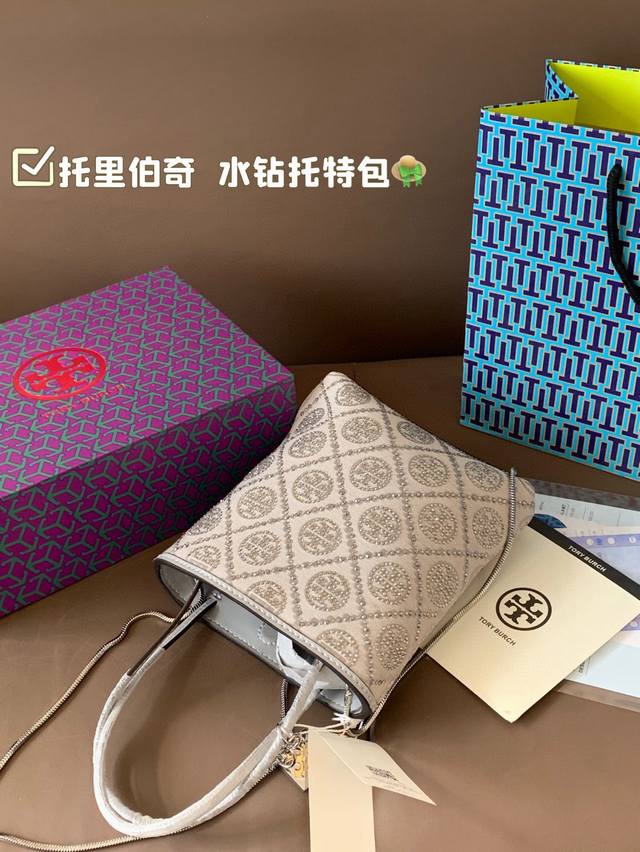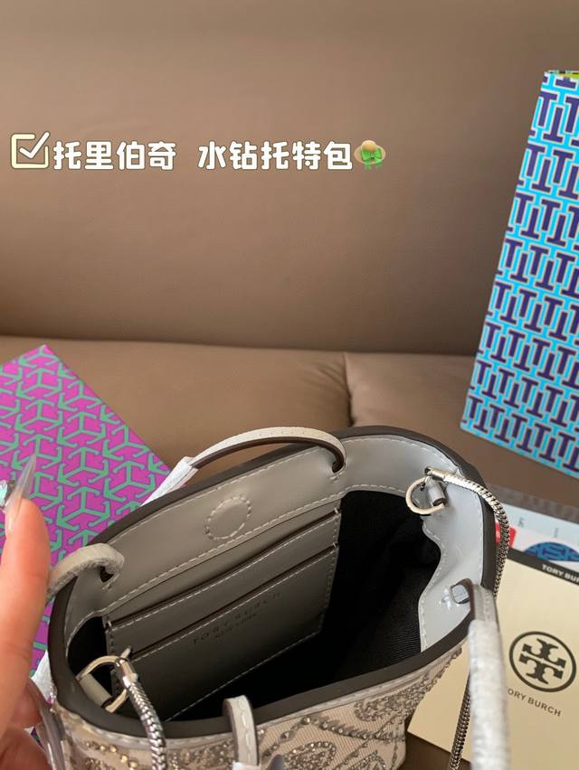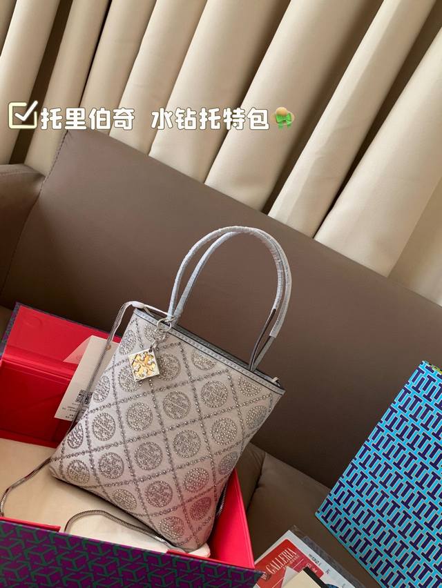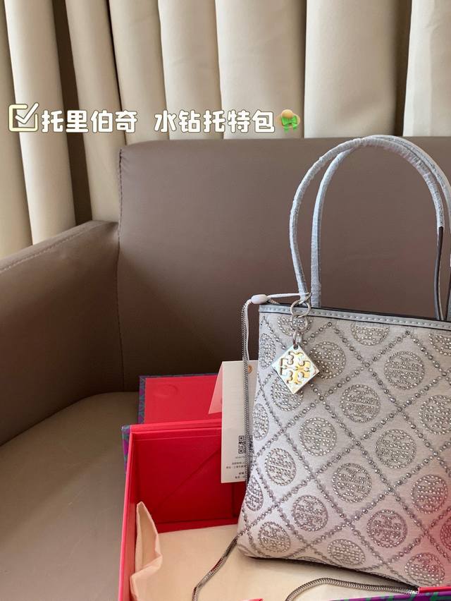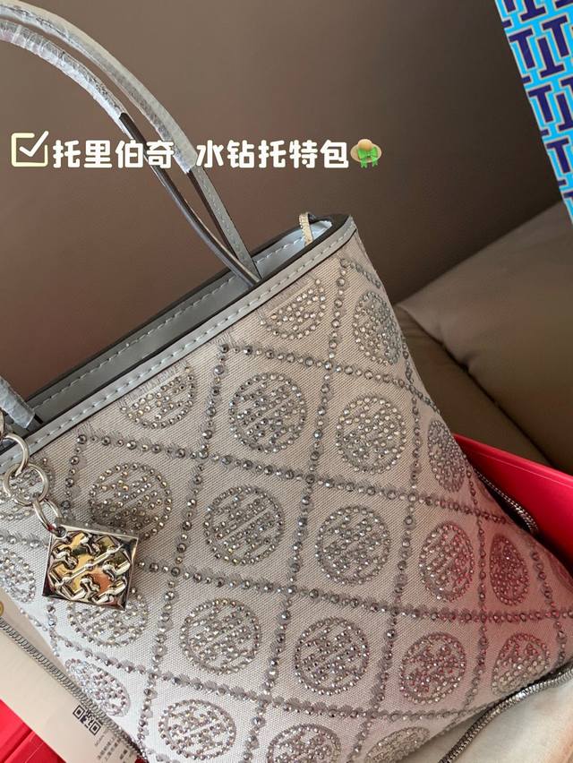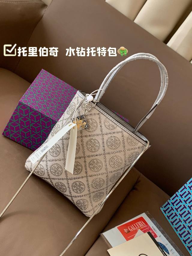 / 配礼盒. 托里伯奇 水钻托特包. 冬日限定款 采用印花纹与满钻面料拼接设计冬季氛围感十足 怎么搭都好看尺寸 16*18Cm