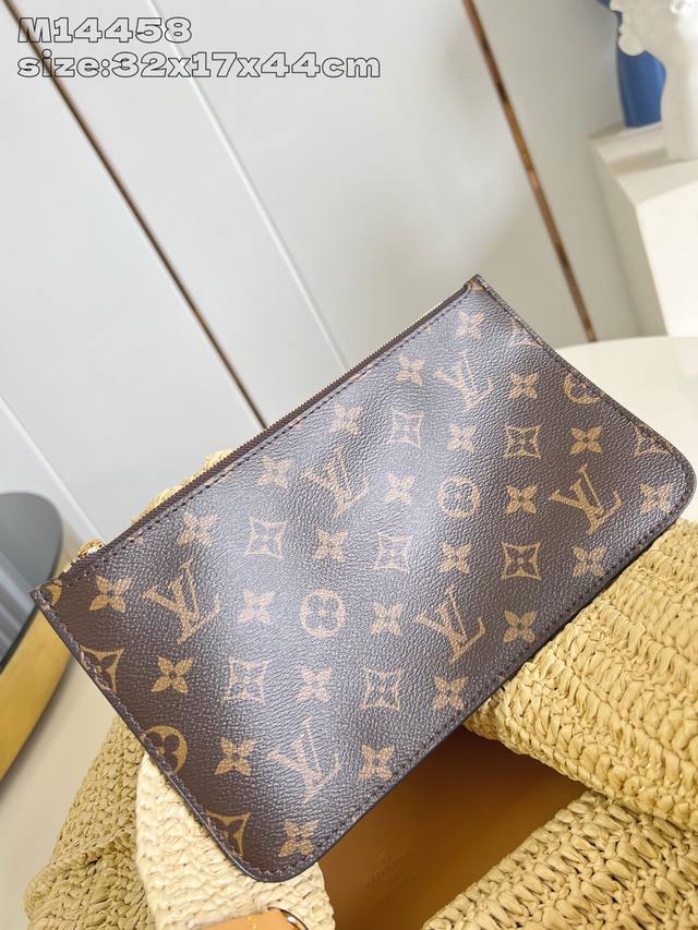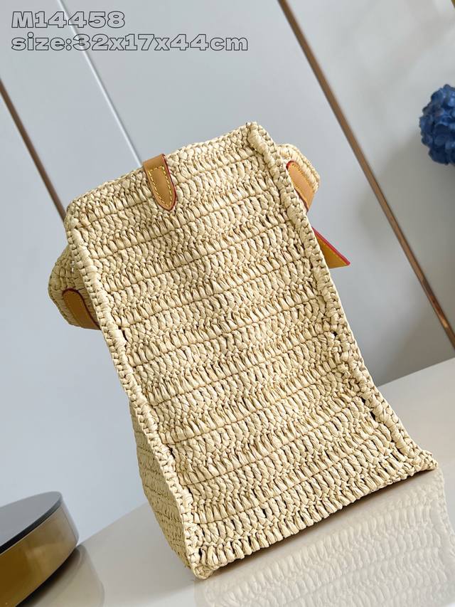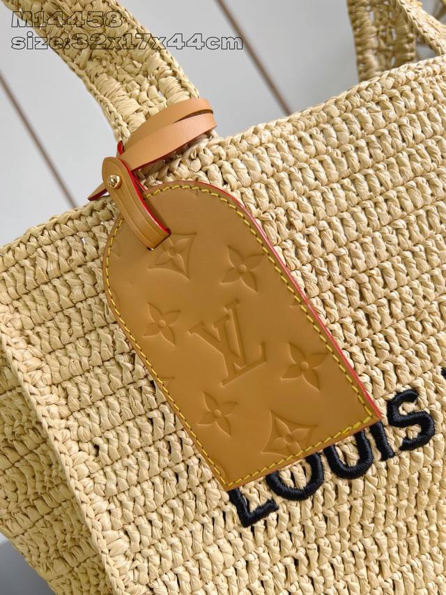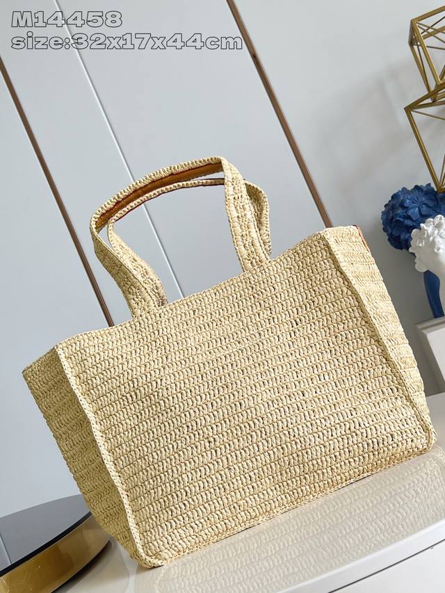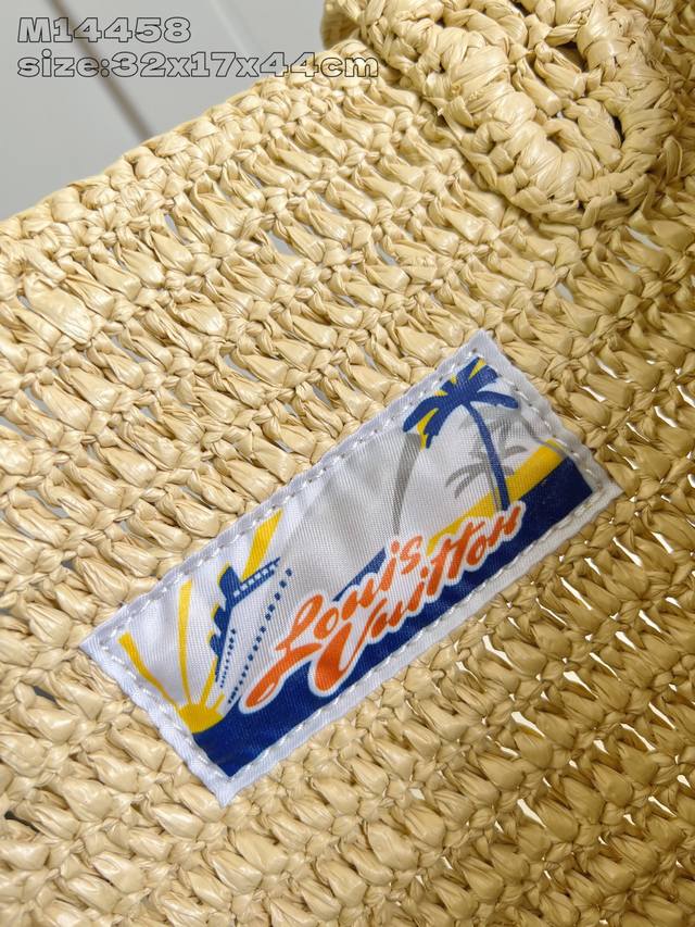 出厂价P 顶级原单 M14458 本款 Shopper Tote 手袋以淡雅拉菲草洋溢夏日气息,巧妙映衬正面路易威登标识刺绣。可拆卸做旧皮革名牌增添复古韵味,内侧路易威登梭织标签点明新季邮轮主题。32 X 17 X 44 厘米 高 X 宽 X 长度